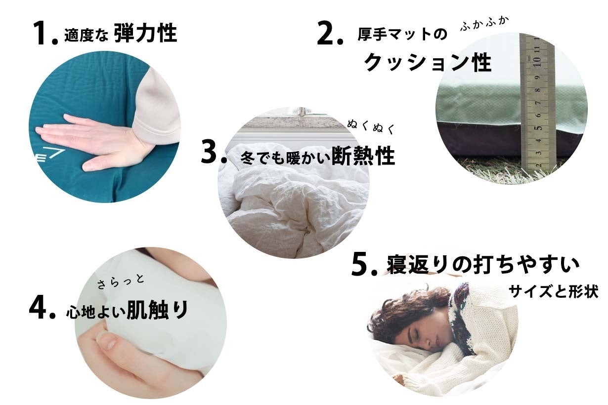 これら5つのポイントにこだわったマットレス。だから、アウトドアなのに自宅のベッドで寝ているような心地よい眠りを再現できるようになりました。