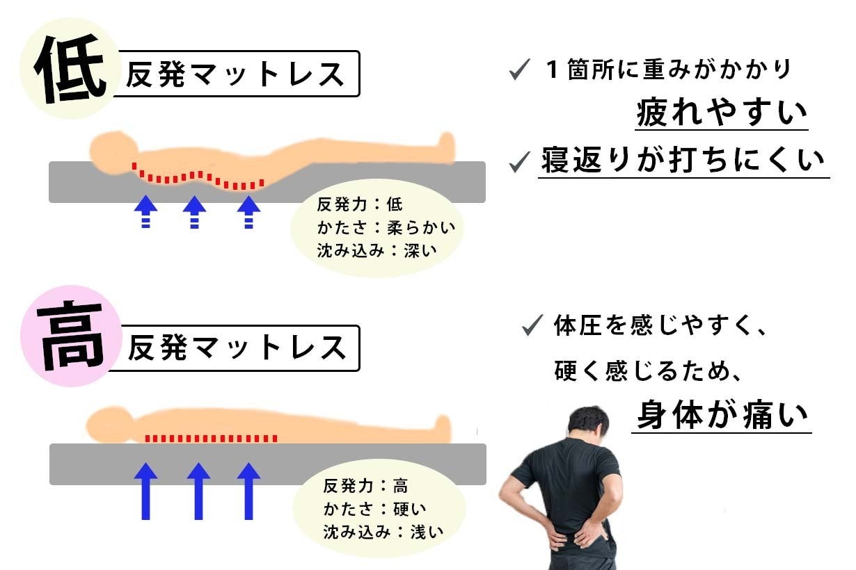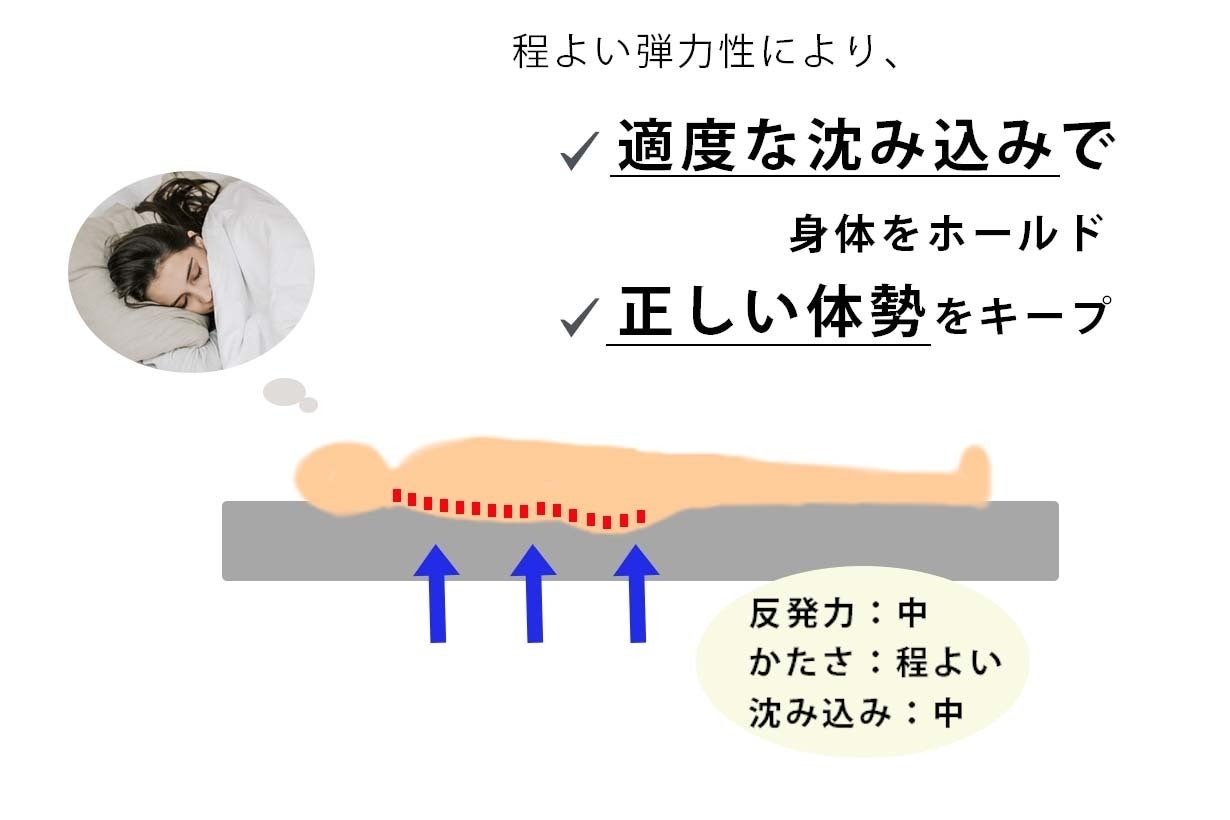 理想の寝姿勢、寝返りの打ちやすさを実現するためには、柔らかすぎる「低反発」や、跳ね返しの強い「高反発」ではなく、適度な沈み込みで身体をホールドし、適切な体勢をキープしてくれる「中反発」マットレスが最適です。