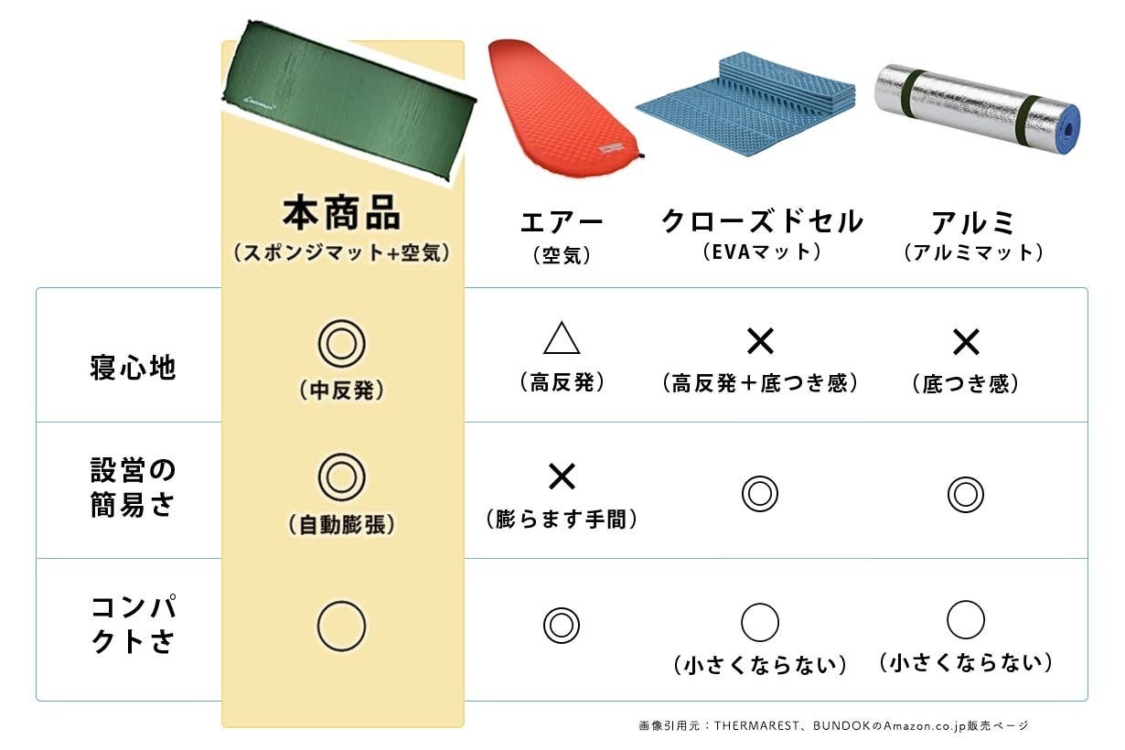 また今回採用している「インフレーターマット」は、キャンプ用のマットレスでよく使われる4種類のマットのうち、もっとも寝心地がよく、使い心地とのバランスの良いものを採用しています。