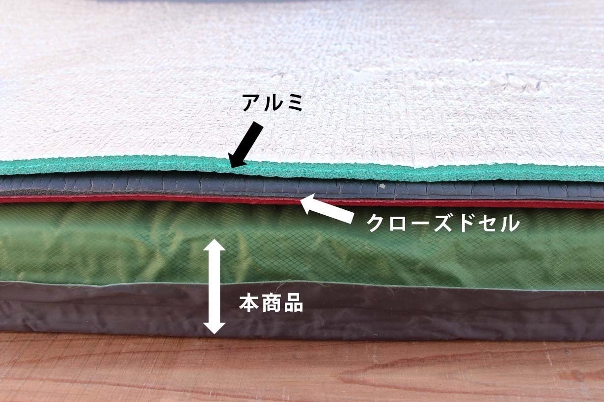 ここで、スタッフの自宅にあった、クローズドセルとアルミマットの厚みを比較してみると・・