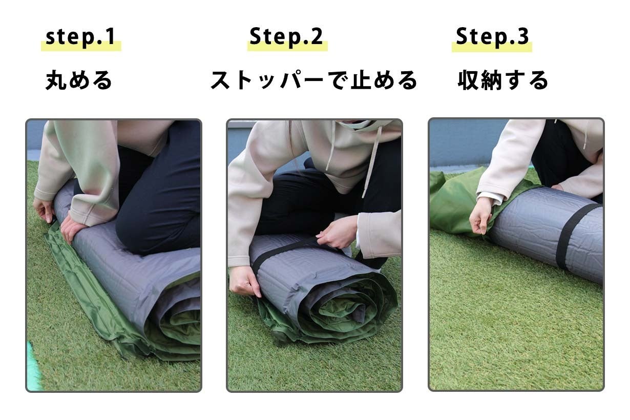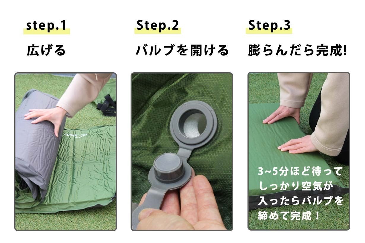 そんな手間を取っ払うのが、この自動膨張機能。マットレスを広げて3分ほど放置すれば、楽々広がります。