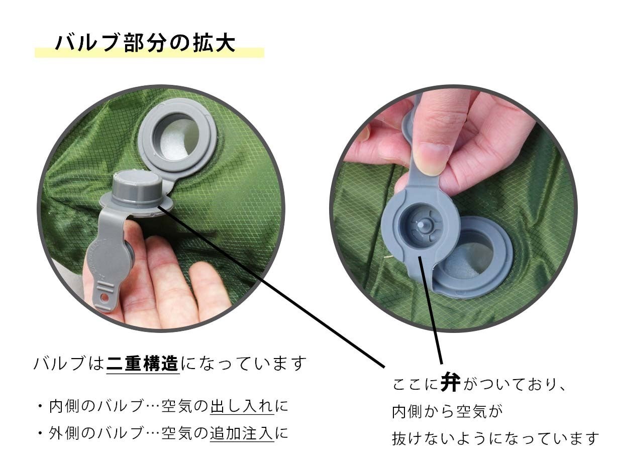 バルブを開けるだけで勝手に空気が入る、"自動膨張機能"を搭載しました。もちろん電池や電源なども不要です。