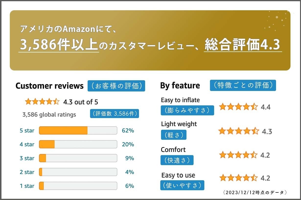 このインフレーターマットは、アメリカで3000件以上、評価4.3のレビューが集まっています。海外から取り寄せ、使い心地や性能を調べたところ、とてもコストパフォーマンスが高く、これならアメリカでの売れ行きと高評価に納得したので、メーカーさんにコンタクトをとり、日本で取り扱わせて頂くことになりました。
