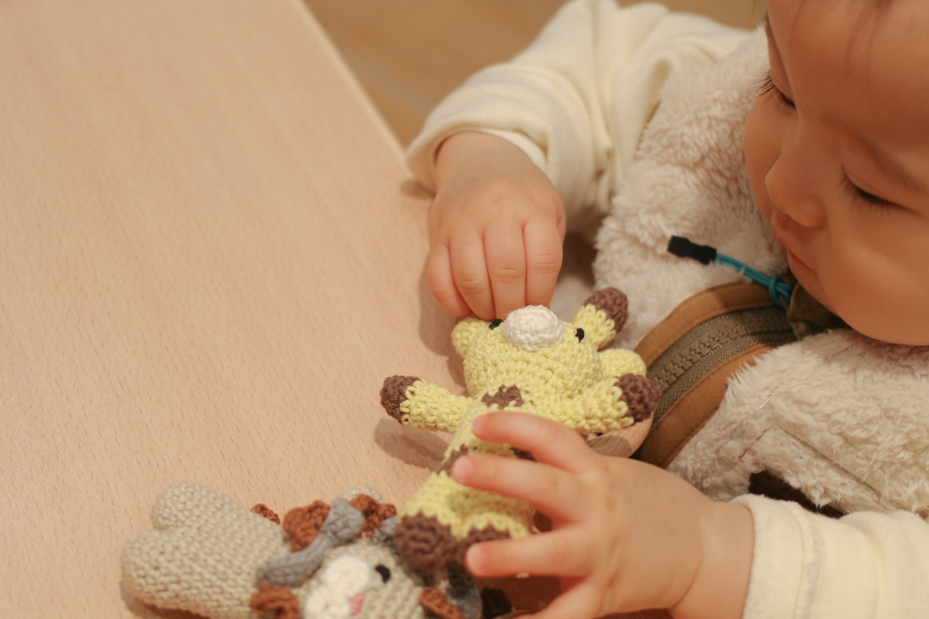 中に鈴と鳴き笛が入ったamimalsは、振ったり握ったりすると可愛らしい音が鳴ります。動物たちの頭の部分には優しい音色の鈴が、おなかの部分には赤ちゃんの興味をそそる鳴き笛が、お出かけ中や寝かしつけ時に赤ちゃんを優しくあやすことができる、ママ、パパのお助けアイテムです