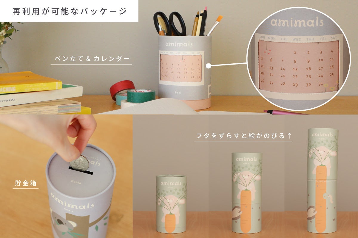 「amimals ラトル」のパッケージは、内側の容器と外側の蓋のデザインが繋がる仕組みになっています。蓋を上げるにつれてどんどん絵が伸びる仕掛けが施されているため、開けたり閉めたりすることで絵が変わるおもちゃになります。蓋には貯金箱としてもご使用いただける穴が開いており、さらに 「amimals マスコット」のパッケージには、蓋に開けられた窓を切り取り線に沿って切り離すと、1年中使える仕様のカレンダーが。パッケージ上部の蓋を外すとペン立てとしてもご使用いただけます。 出産のギフトやお誕生日のプレゼントにも素敵なパッケージ付きのリターンです。