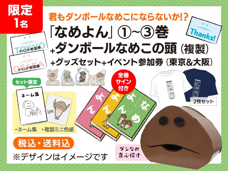 「なめよん①〜③巻(全巻サイン入り)」+「アクスタ・Tシャツ(ホワイト)・Tシャツ(ネイビー)」+「ネーム集・複製ミニ色紙」+「東京・大阪イベント参加券」に「ダンボールなめこの頭」がついた限定数1点のスペシャルプランです。