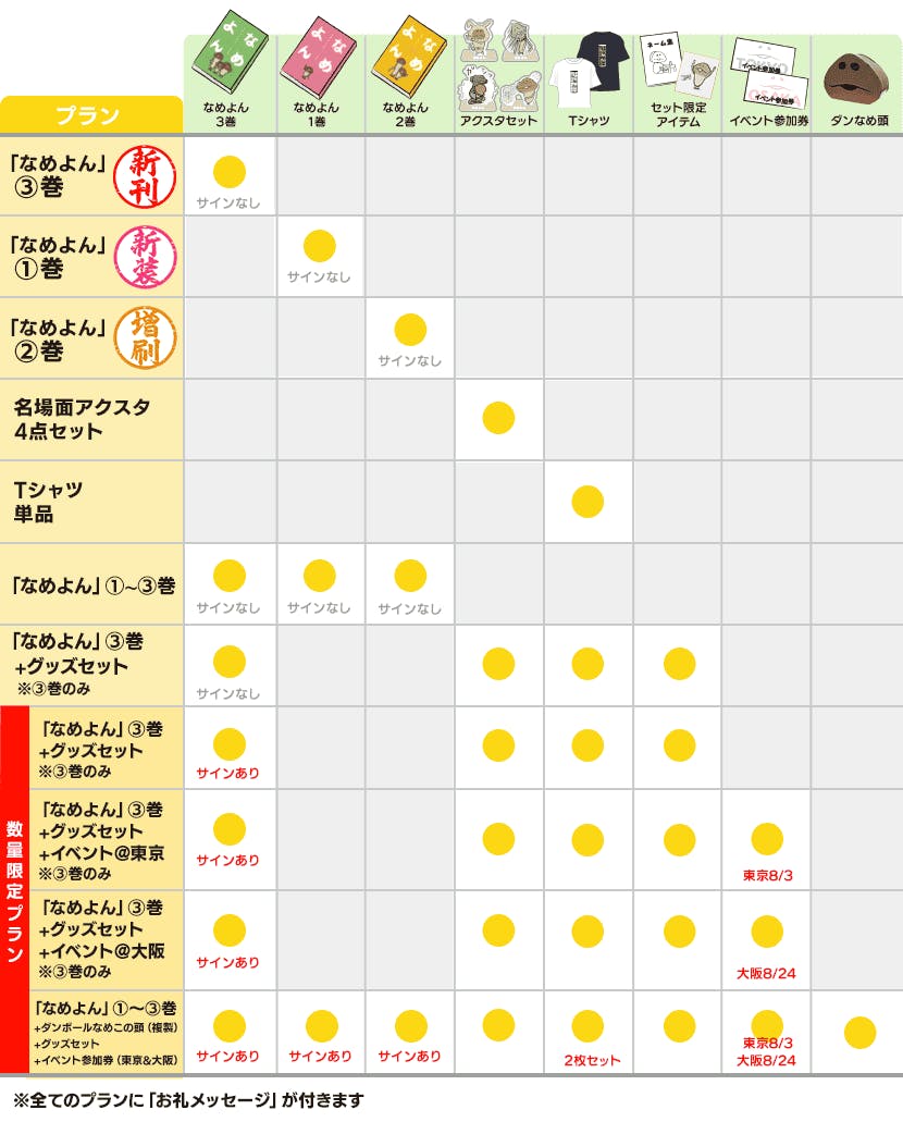 「なめよん③巻+アクスタ+Tシャツセット」には数量限定のプランが3種類あります。