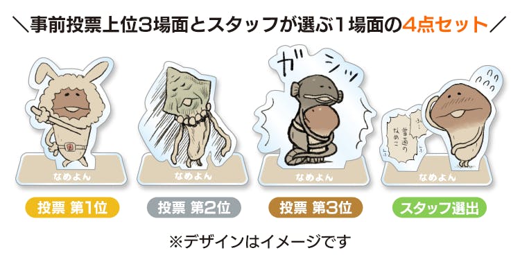 なめよん③巻収録エピソードの中から読者投票で選ばれた3場面に、ビーワークススタッフ選出の1場面を加えた4場面をアクリルスタンドにします!