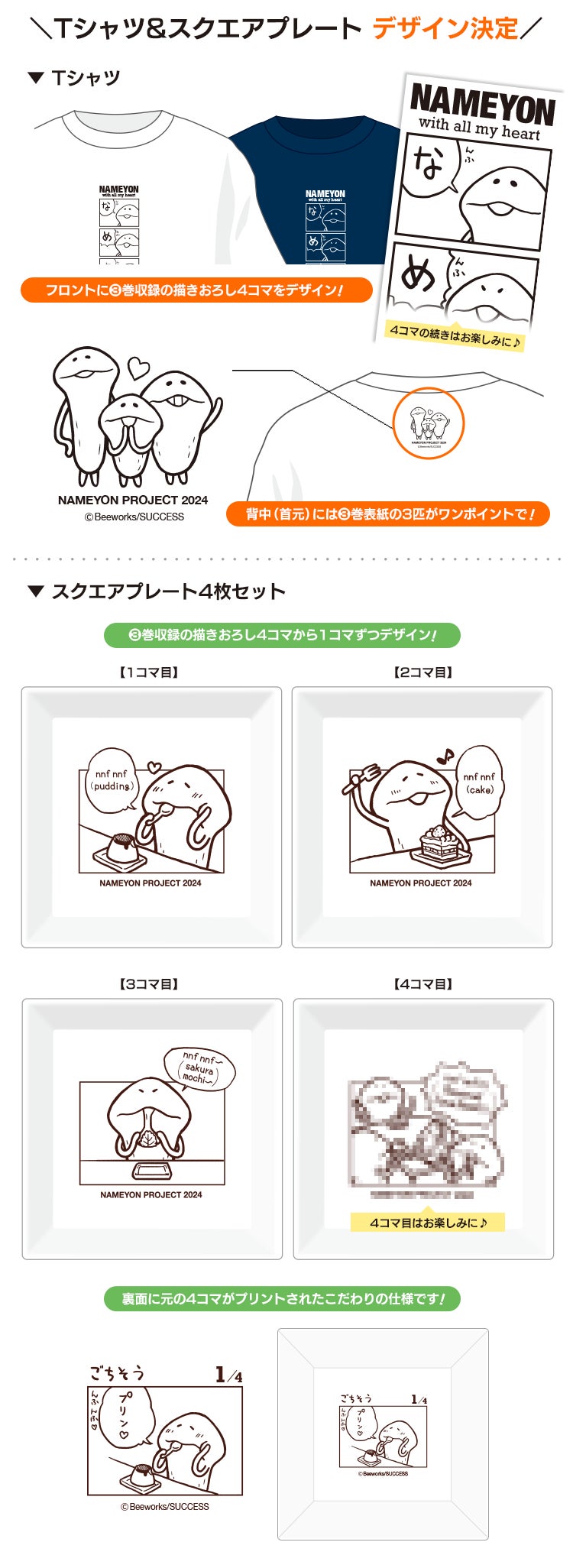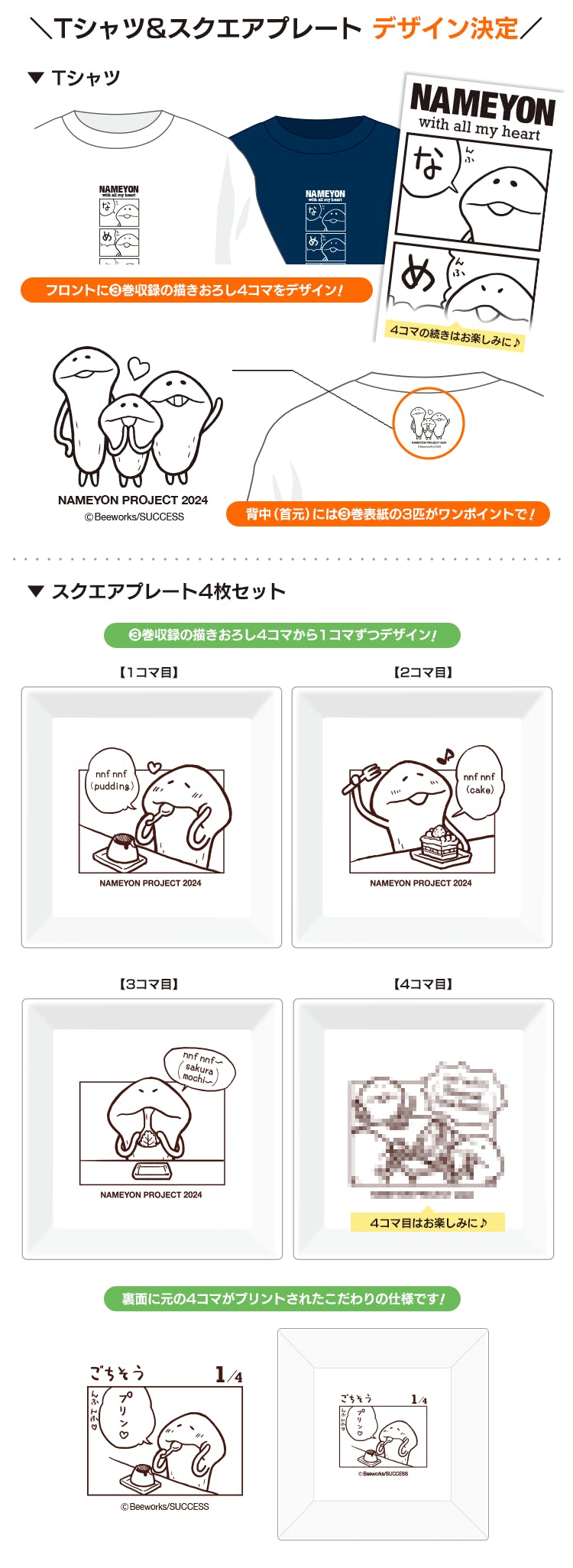 「なめよん③巻描き下ろし4コマ」をデザインする「Tシャツ」と「スクエアプレート4枚セット」について、実際のデザインを少しだけお見せしちゃいます!