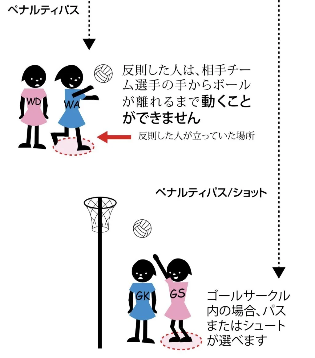 ネットボールでは、ボールを持っている人に対して、周囲90センチ以上離れないとディフェンスができません。さらに、離れているからといってボールを持っている人の身体に触れたり、持っているボールに触ったりすると反則になります。
