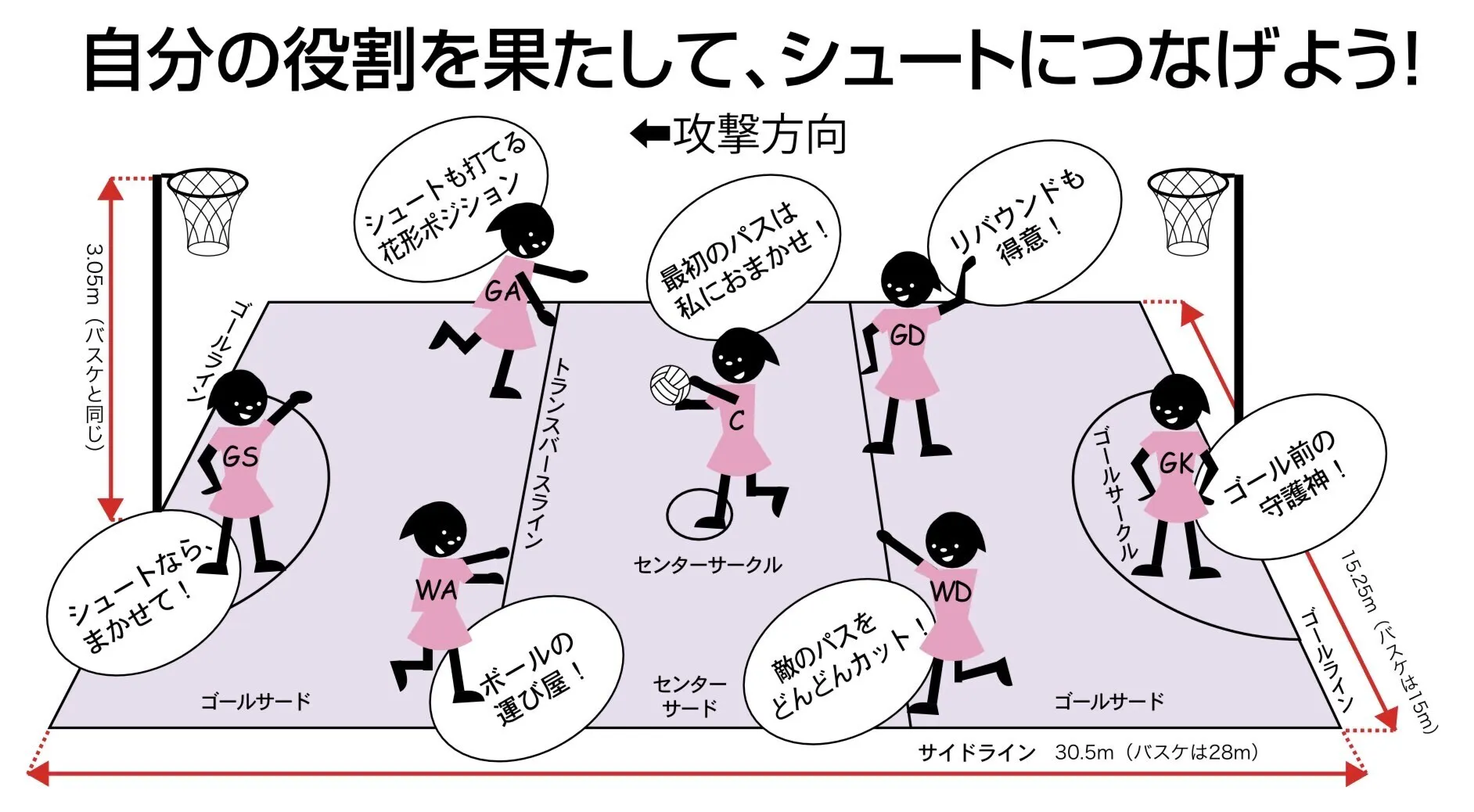 シュートを打てる人・・・GS(ゴールシューター)/ GA(ゴールアタック)の2人のみ