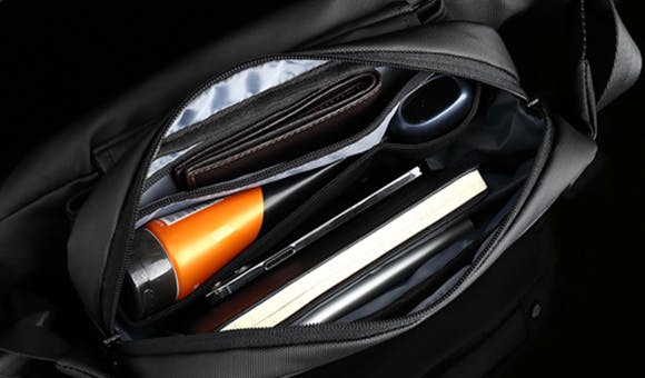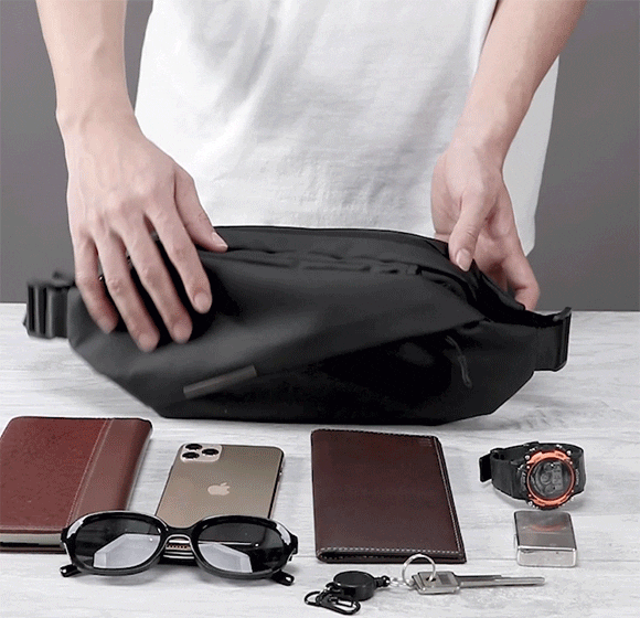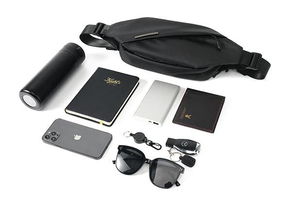 財布、手帳、スマホ、イヤホン、モバイルバッテリー、名刺など必要なものをすべて入れても、余裕のあるサイズ感で装着感を損ないません。