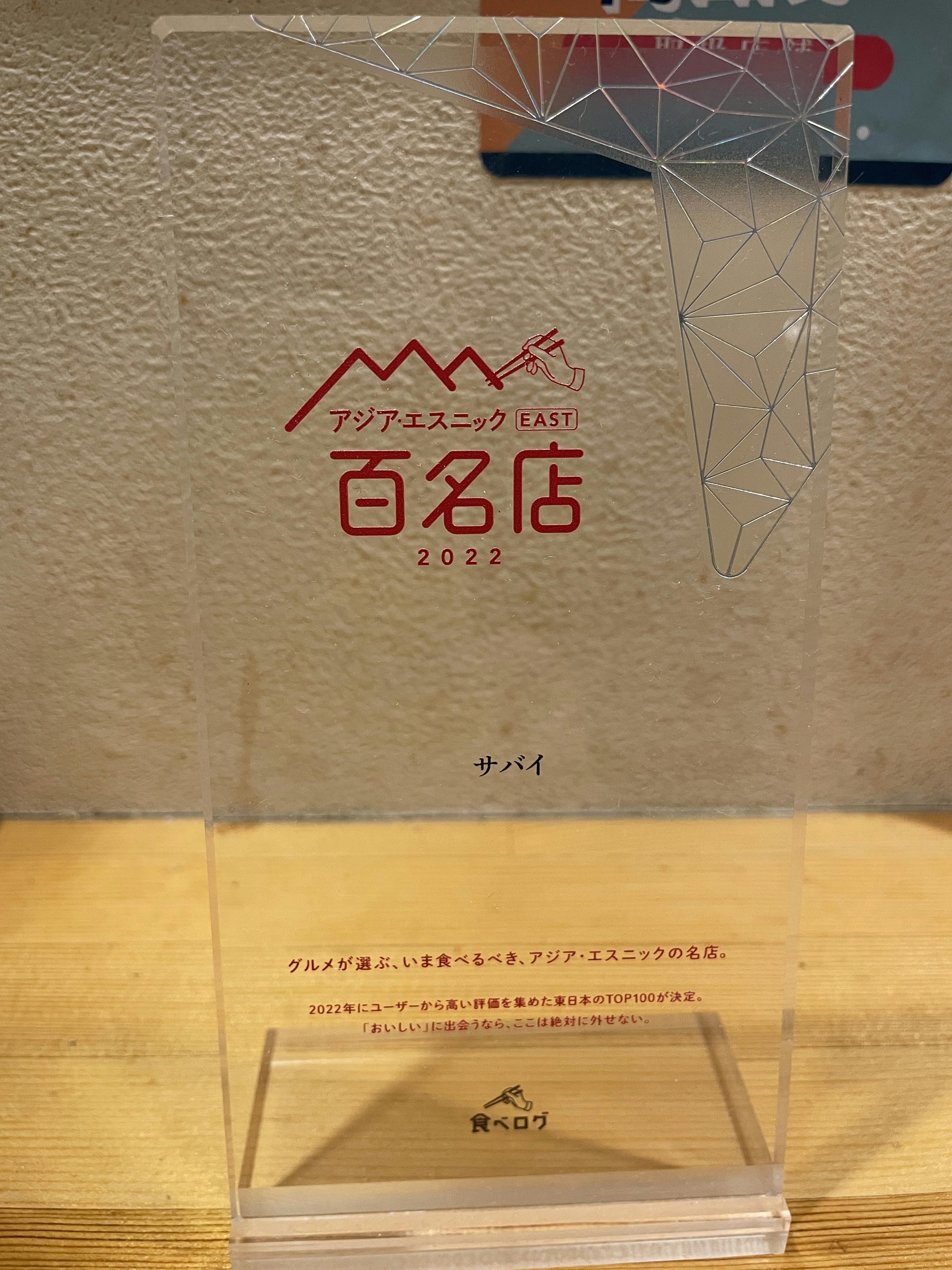 また光栄な事に『食べログ』様より2022年にエスニック部門で東日本ベスト100に選ばれ盾を頂きました。