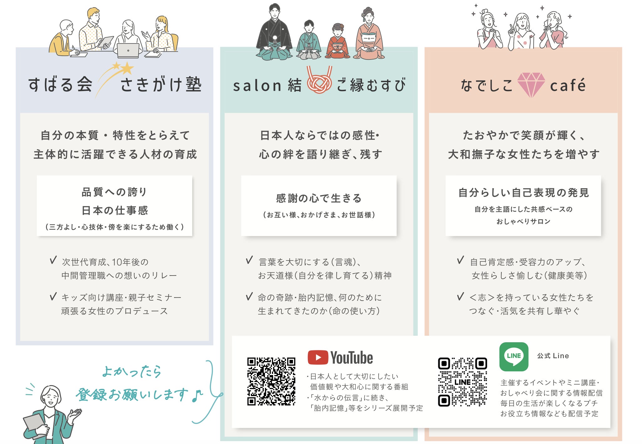 ・従前は、女性たちのおしゃべり会や子自分の気持ちを整える学びを提供しておりました。今後は「育児や子育てなどの人生のライフステージにおける”ひとりひとりの人生役割の変化と課題”へのトータルサポート」という、コミュニティサービスを提供できたらと考えております。