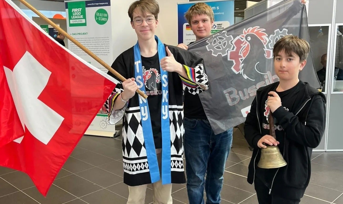 私たちの法被は海外でも人気があり、FLLを通じて友達になったスイスのFLLチームBussibotはスイス大会、ドイツ大会で着用してくれました。