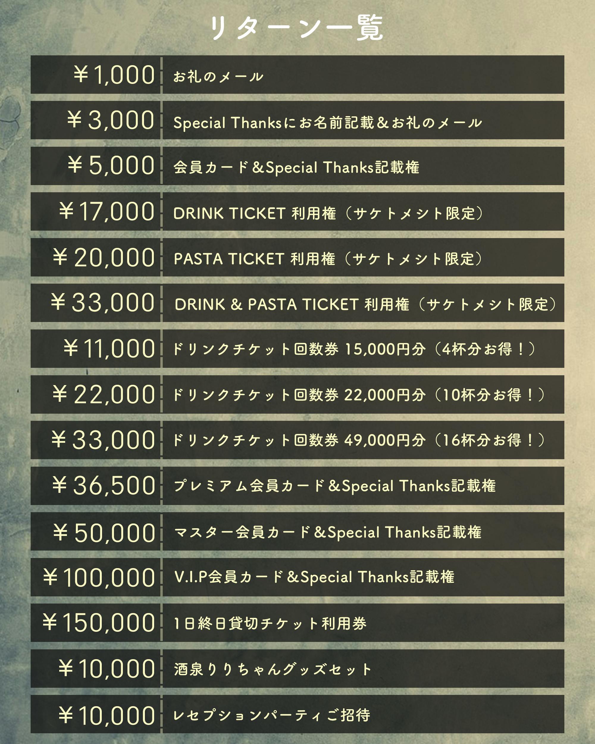 ご支援頂ける皆様に沢山のリターン及び感謝の気持ちを