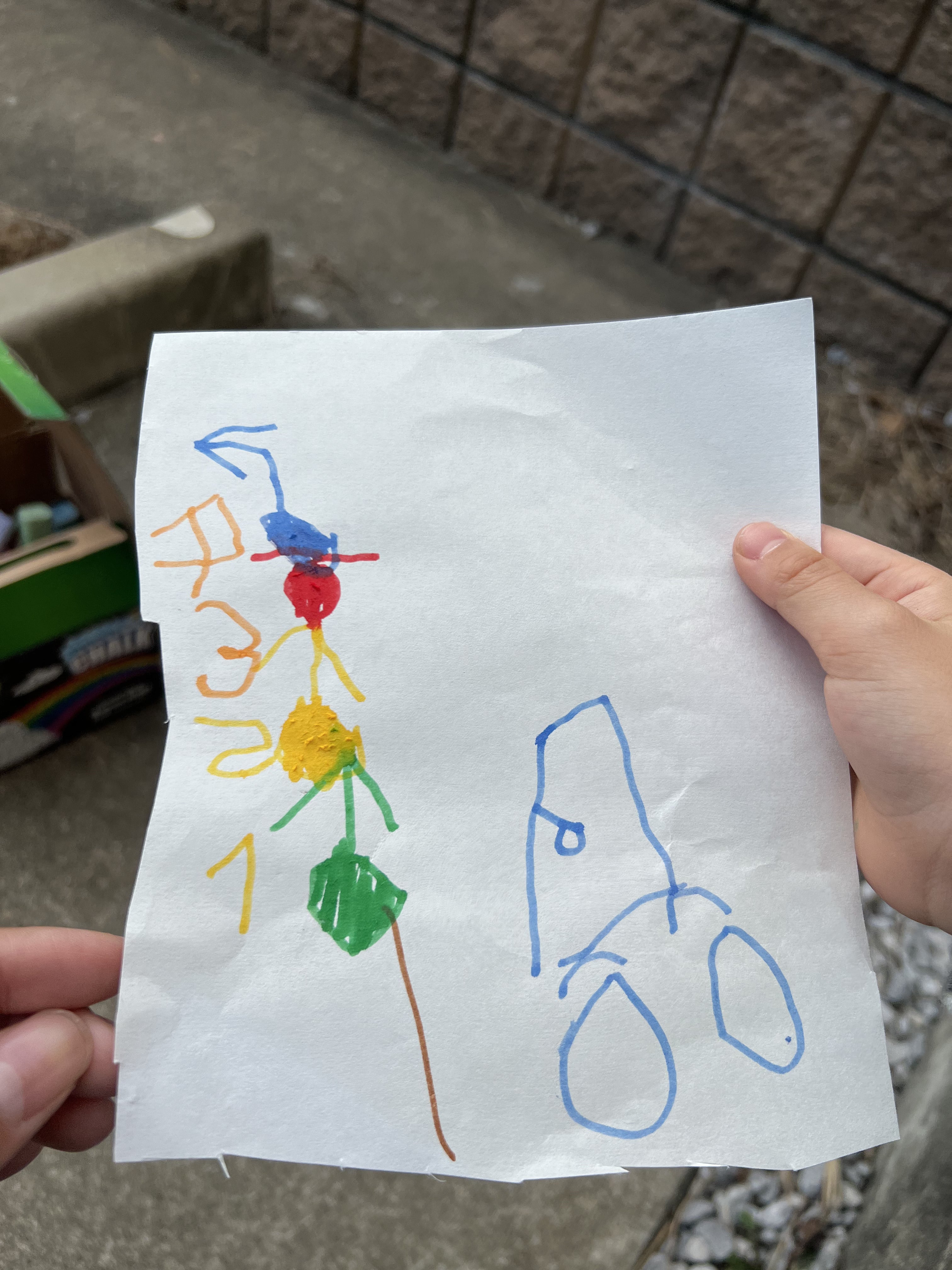2023/03/30 21:20保育所保育指針より幼児期の終わりまでに育ってほしい10の姿〜13:数量や図形、標識や文字などへの関心・感覚〜「遊びや生活の中で、数量や図形、標識や文字などに親しむ体験を重ねたり、標識や文字の役割に気付いたりし、自らの必要感に基づきこれらを活用し、興味や関心、感覚を持つようになる。」初めに一緒に駐車場で「走って!止まって!曲がって!」初めは彼の指示にロボットのようになり、遊んでいたところからです。「え〜〜〜わかんないよ!」私の一声をきっかけに彼がチョークで書いてくれたのがこちら↓「赤が止まれ!青は進め!黄色はゆっくり!」標識の役割に気付いて活用してますよね!!!そして相手にわかるように伝えるツールとして言語以外の表現方法として選んでいます。数字は後で彼が「もっとわかりやすいように」と足してくれたものです。「1、2、3、、、、4だけ書いて!」ゆっくりゆっくり少し遅いと感じるくらい無言で書いて見せます。特に言葉は要りません。その次の日彼が一番に渡してくれたのがこれ↓後からお母さんに話を聞いたのですが、「繊細さがあるみたいで文字がうまく書けない!ってなって以来、最近全く書かなくなってたんです。明日渡すから!って自分で用意してたのびっくり!」昨日書けなかった「4」にも挑戦していますし、「誰かに何かを伝える」という文字の役割や機能についてもしっかり学んで意欲的に自主的に取り組んでいますね!他にも一緒に走る中で「○週目〜」と数えて助数詞をさらっと入れたり、保育士は遊びの中で子どもたちがたくさんの学びを得られるように援助します。走っている中では、体のバランスや体幹に異常がないかを観察していますし、どこに興味関心があるのか素早く洞察します。援助がいるのか、いらないのか瞬時によく考えます。保育所保育指針とは国が出している方向性。国は世界の動きを踏まえた上で、今の子どもたちに必要な力としてこんな風にしっかり明記しているのです。「本人の必要感に応じて」!!!!重要なのはここです。早く〜〜できるようになってほしい勉強で困らないようにしてあげたいもちろん周りの大人や親の子どもを思う気持ちはわかりますが、早期の認知的教育はあくまでも「本人の必要感に応じて」「自主的に」でなければ小学校3年生以降で逆転することがわかっていますし、英語教育も「ダブルリミテッド」と言って危険性を孕んでいます。本当に必要な情報が子育て世代に届きますように!!! もっと見る