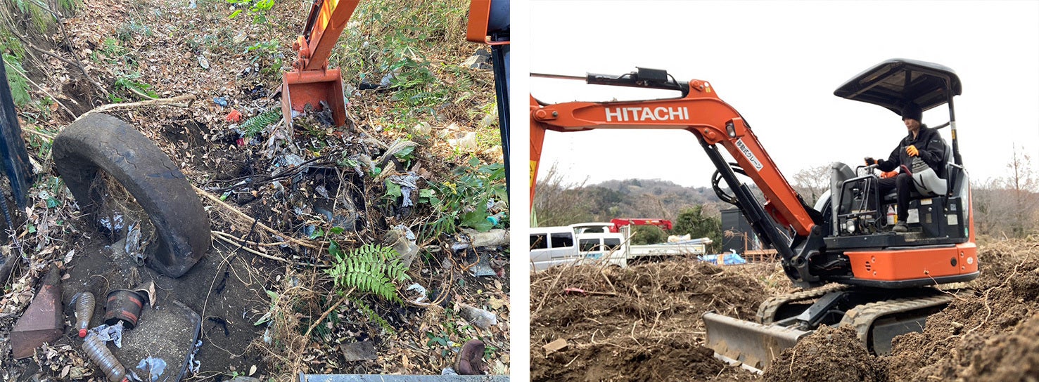 その後ユンボちゃんと一緒に地道な開拓作業を開始。草山の後は不法投棄されたゴミ山との戦いが待ち受けていましたが、半年後にはこんなに綺麗になりました!