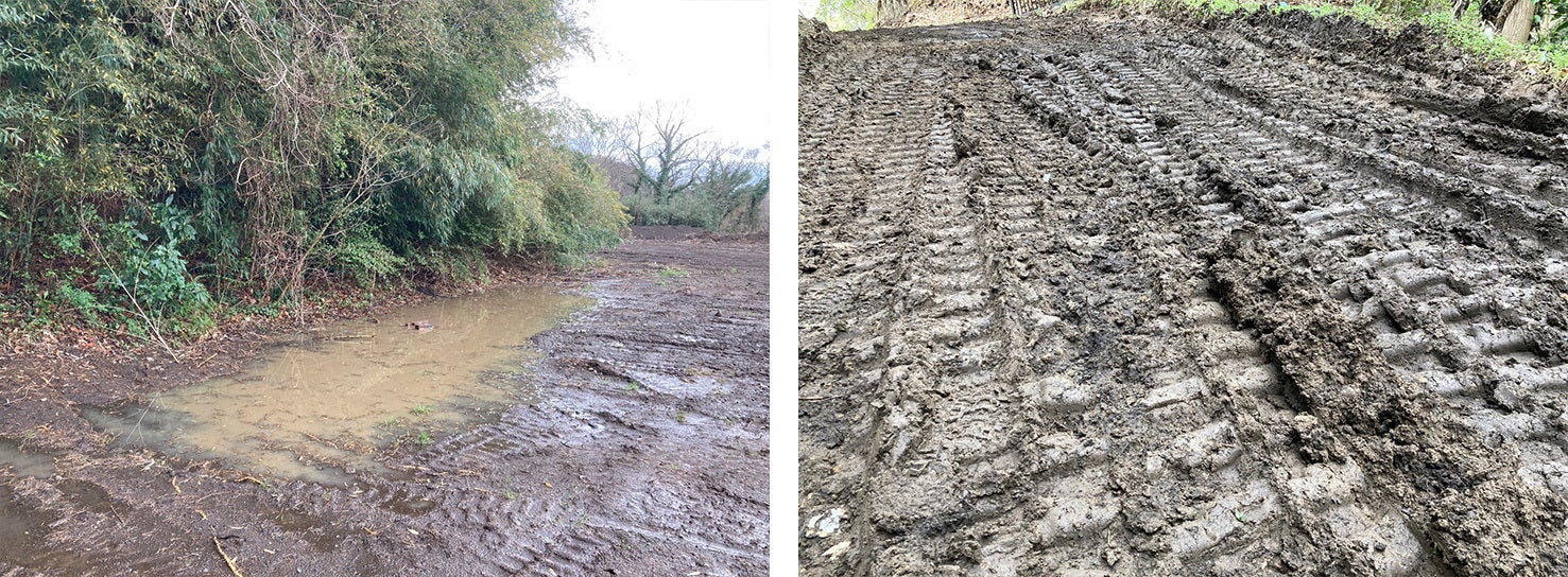 元々接道条件が悪かったため、キャンプ場に入ってくる道を新たにユンボで切り拓いたのですが、水捌けの悪い土で傾斜もあり、雨が降るとぬかるんで非常に危険です。ご来場者の皆様の安全面を考慮すると約130mある道の舗装工事が必須だと判断しました。