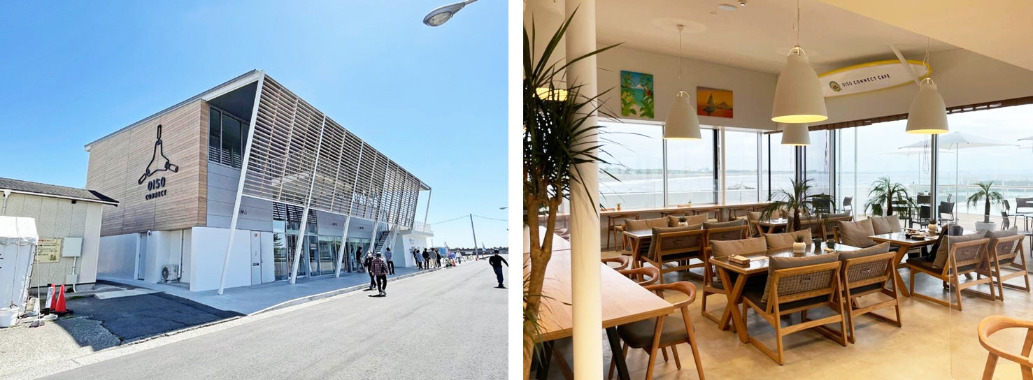 大磯港賑わい創出施設。ショップエリアでは大磯港で当日水揚げされた「活きのいい魚」や「鮮魚」等の販売はじめ、地産の朝採り野菜や、農産物品などや町内で生産される加工品・特産品などの販売、またスナックコーナーでは地元大磯の食材を使用した「OISO CONNECT カレーパン」「フィッシュバーガー」や「オリジナルソフトクリーム」などを楽しめます。