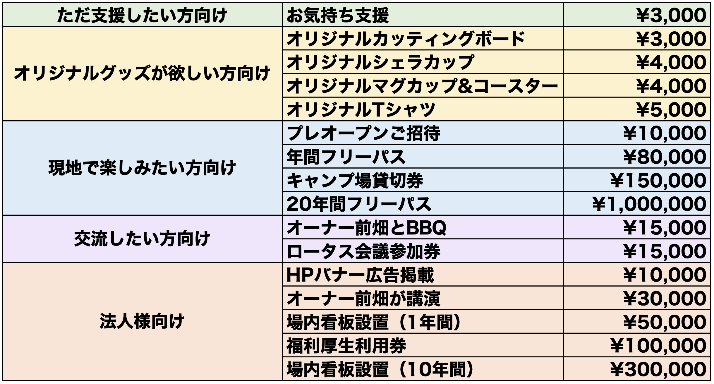 2023/09/26 08:539月23日、無事にキャンプ場プレオープン初日を迎えました!こちらも慣れていない中多々ご迷惑をお掛けした部分もあったかと存じますが、まずは無事に事故なく終了できたこと、そしてご来場の皆様には温かく接して頂き心より感謝申し上げます。追い込み作業でハードな毎日の中、準備が間に合うのかここ2、3日は特に冷や冷やしておりましたが、皆様の笑顔や子供たちの笑い声が聞けてホッとしました。素敵なお花も頂きました!そして、じゃがパパファームさんのご協力で、キャンプ場内に大磯の無農薬野菜直売所を設置して頂きました。まだまだ始まったばかりですが、より良いキャンプ場にしていくため、これからも改善と改良を重ね精進して参りますので、お気づきの点やご意見、ご要望などがございましたら何なりとお申し付けください! 現在、皆様のご意見なども参考に料金システムや予約システムなどの詳細を詰めておりまして、10月中には一般の方々にもご来場頂ける様にしていきたいなと考えております。 準備が整いましたら、こちらの方でもお知らせ致しますので、もう暫くお待ち頂ければと思います。 これからも温かい応援の程、何卒よろしくお願い致します。 もっと見るリターン品誠意製作中!!