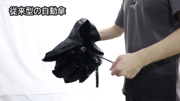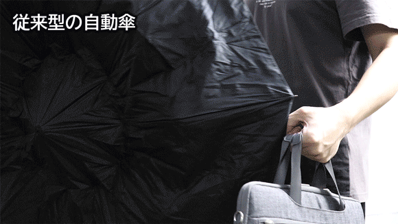 従来の自動開閉式折りたたみ傘はボタンを押すと開かれますが、閉める時には必ず両手を使わなければなりません。