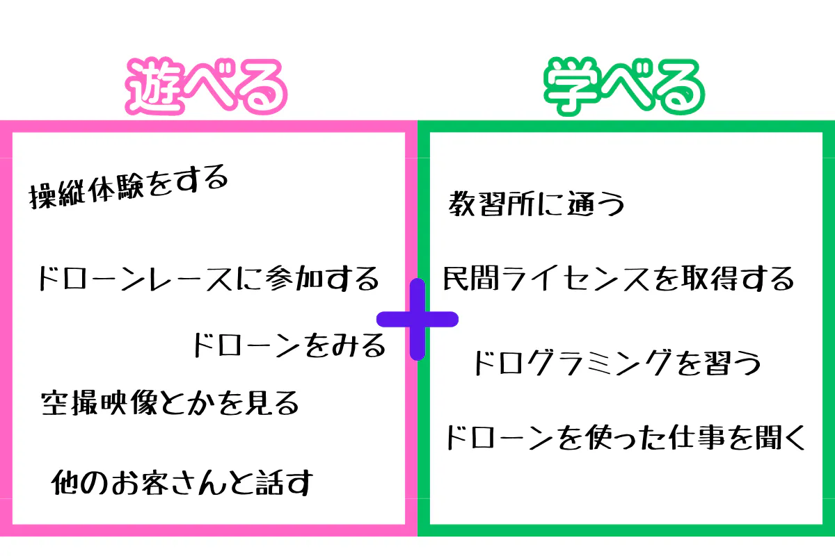 イベントやスクールの最中に「実際ドローンについて聞きたいときはどこにいけばいいの?」「ドローンをしてる人ってどこにあつまるの?」「いろんな商品を見てみたい」「ホビードローン体験をもっとしたい!」などなど沢山のお声を頂いておりました。