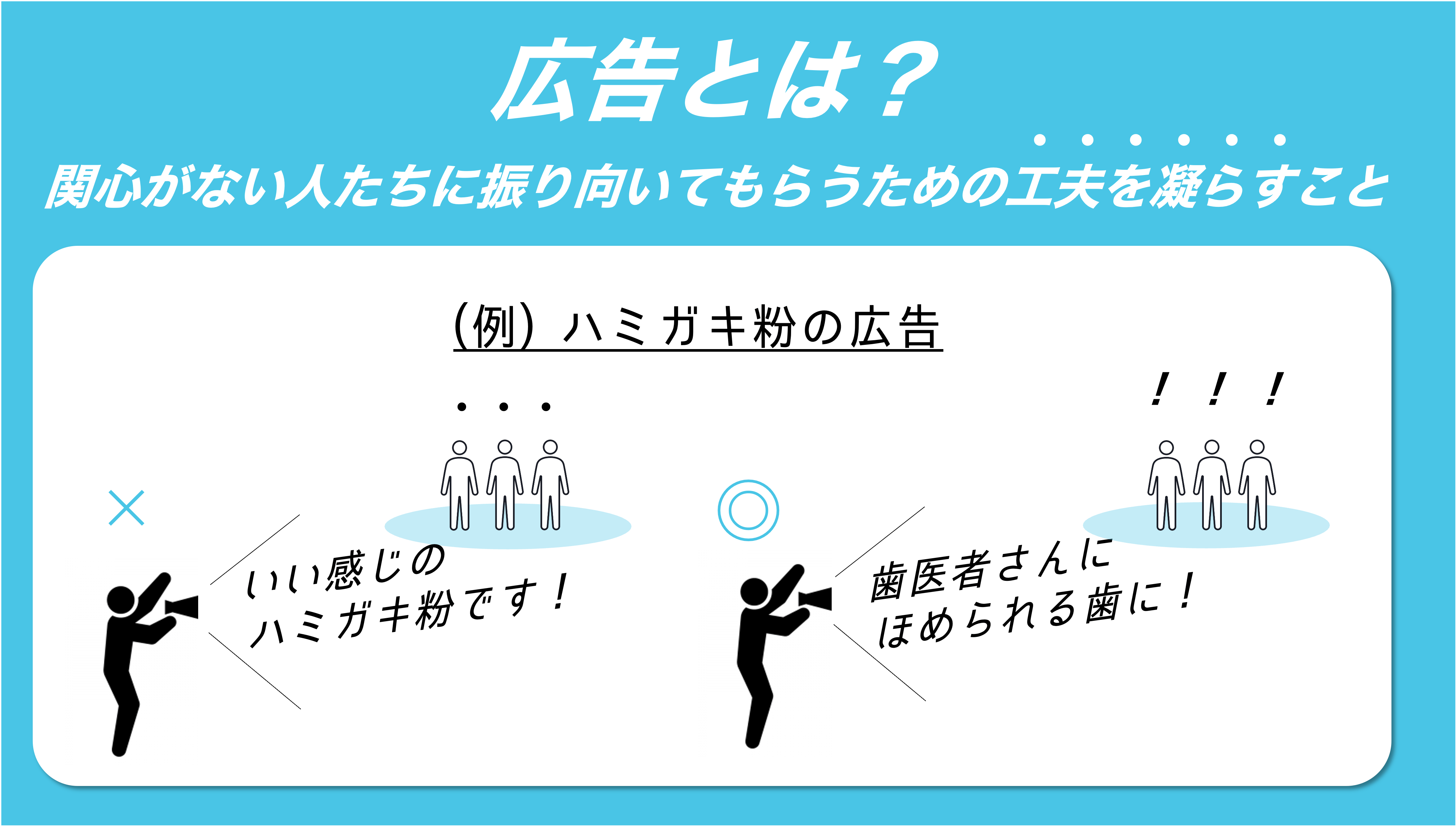 広告とは、関心がない人たちに振り向いてもらうための工夫を凝らす仕事です。