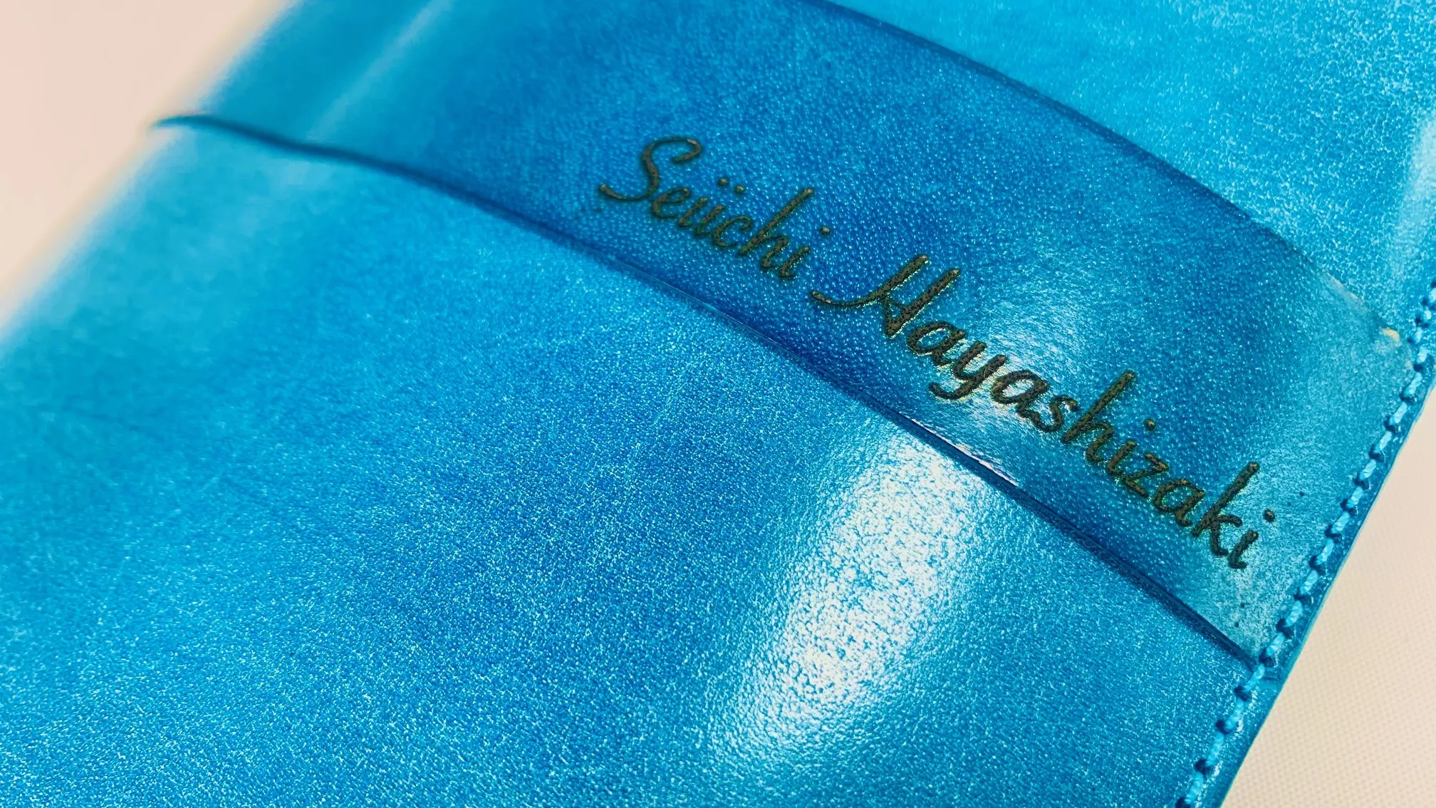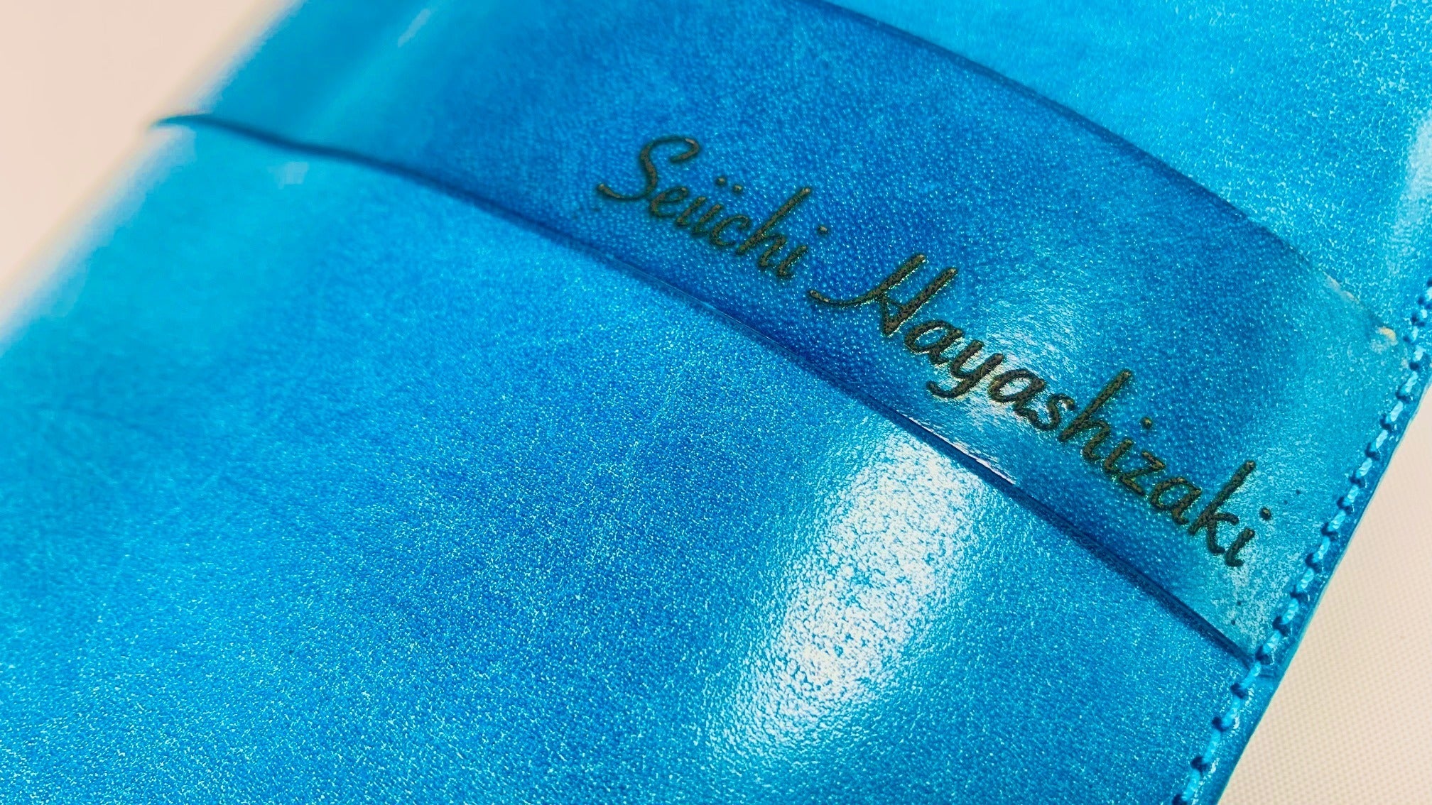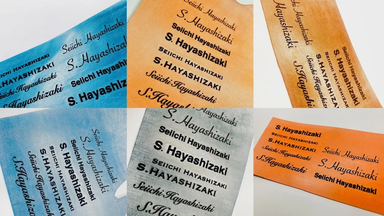 ※私の個人名を6cm幅フルネームでレーザー彫刻名入れした画像です。ベジタブルタンニン鞣しのヌメ革だからこそ、曲線が多いアルファベット筆記体でもエッヂの効いた名入れになっております。