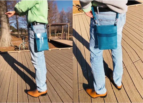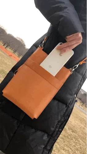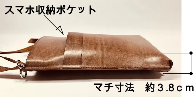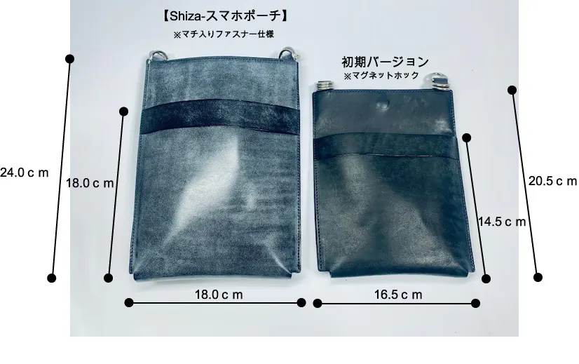初期バージョンから高さを3.5cm 横幅を1.5cm マチ幅を1.3cm大きく・前面ポケット口を3.5cm高くすることで大切なスマホをスッキリ収納保護