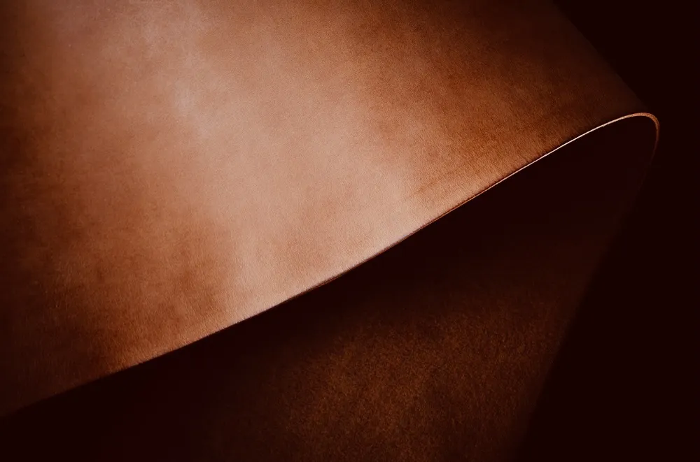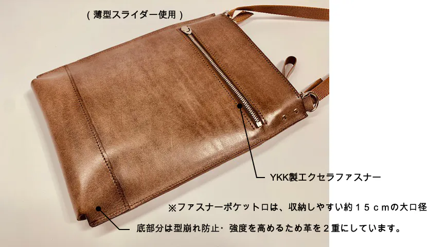 純国内産の本牛革(フルベジタブルタンニン鞣しのヌメ革)を使用し芯材など貼り合わせのない1枚仕立て
