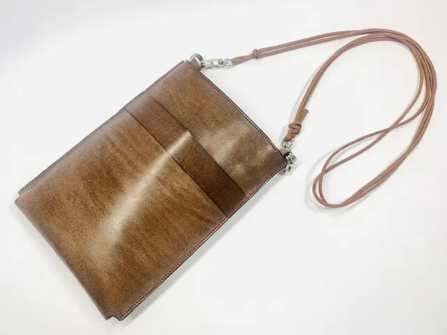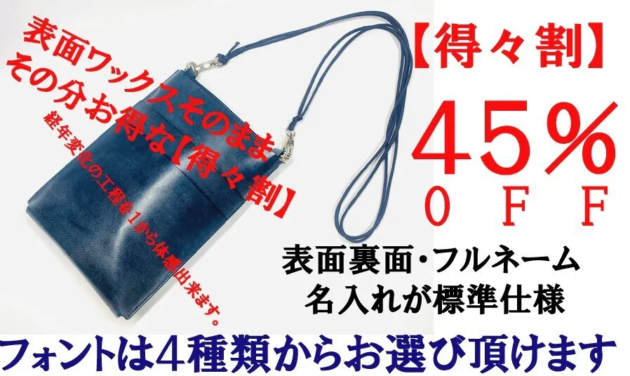 【得々割】 表面ワックスそのままの完成品1個(表面裏面フルネーム名入れ1箇所づつ) プロジェクトページ内でもご説明の様に、今回使用する皮革の表面にはワックスが前面に乗っております。そのワックスを縫製等に必要な分のみを磨きを掛け、残りはお客様がお好みで磨いても良し、そのまま経年変化でワックスが馴染む状態を体感し頂ける【得々割】になります。 お好きなカラー本体1点(2種類のショルダーベルト付き) 一般販売価格 ¥19,500(税込・送料込)のところご支援様限定45%OFFの¥10,900(税込・送料込)でご予約承ります。 ■カラー:6色の中から1点をお選びください。