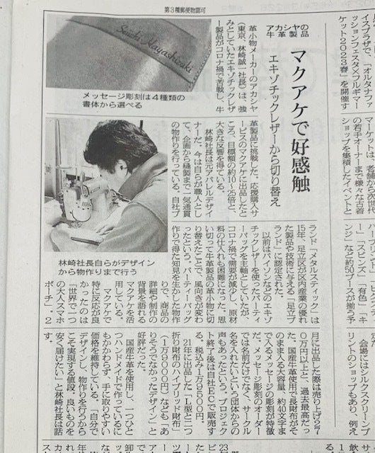 3月22日「繊研新聞」にて『メッセージスマホポーチ』が掲載されました。2月15日から開催されました「東京インターナショナル・ギフトショー2023」足立区公式事業の『足立ブランド』ブースにて今回のメッセージスマホポーチを展示させて頂いた時の繊研新聞社記者さんに取材を頂きましていろいろとお話しさせて頂き今回掲載して頂けました。他社クラウドファンディングですが、今回のプロジェクトにて期間限定価格帯でのご紹介も終了になります。