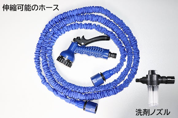 さらに、2.5m~7.5m伸縮可能のホース、洗剤ノズルと7種類噴射モードが可能ノズルをセットで別途用意しました。購入した場合は本体とともに発送いたします。