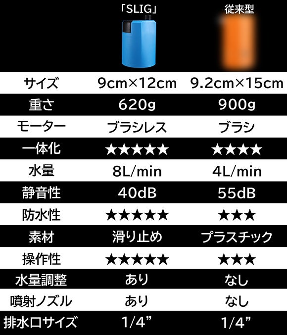ブラシモーターを採用した従来品とは違って、「SLIG」は高性能のブラシレスモーターを採用したことで、より強い水圧と多い水量を可能にしたため、様々なシーンに対応します。