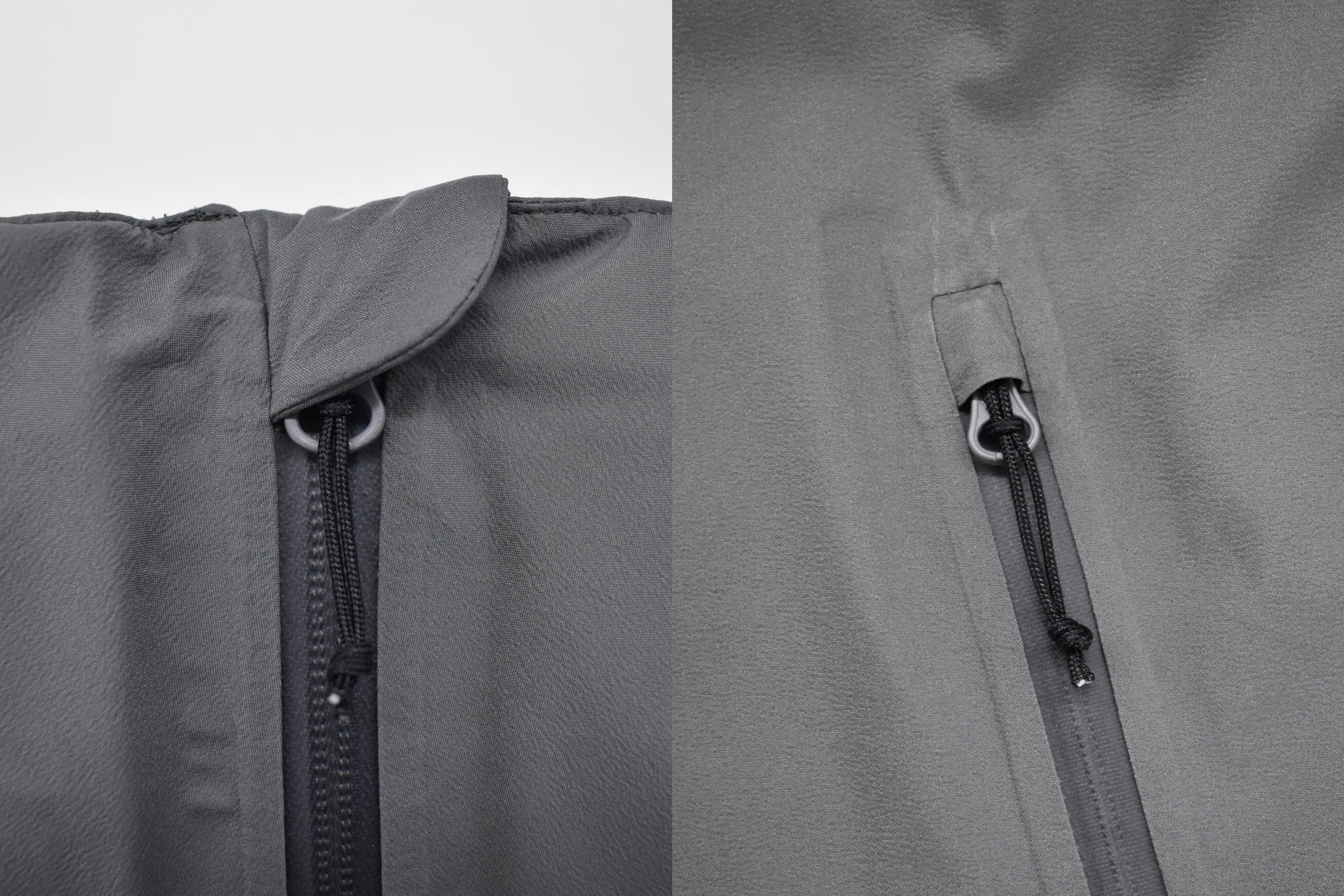 今回はダウンウェア用という事で通常F/ACSIONのレインウェアに使用している3層構造の素材を、軽さとストレッチ性を重視し特別に専用の2層構造素材を使用しています。