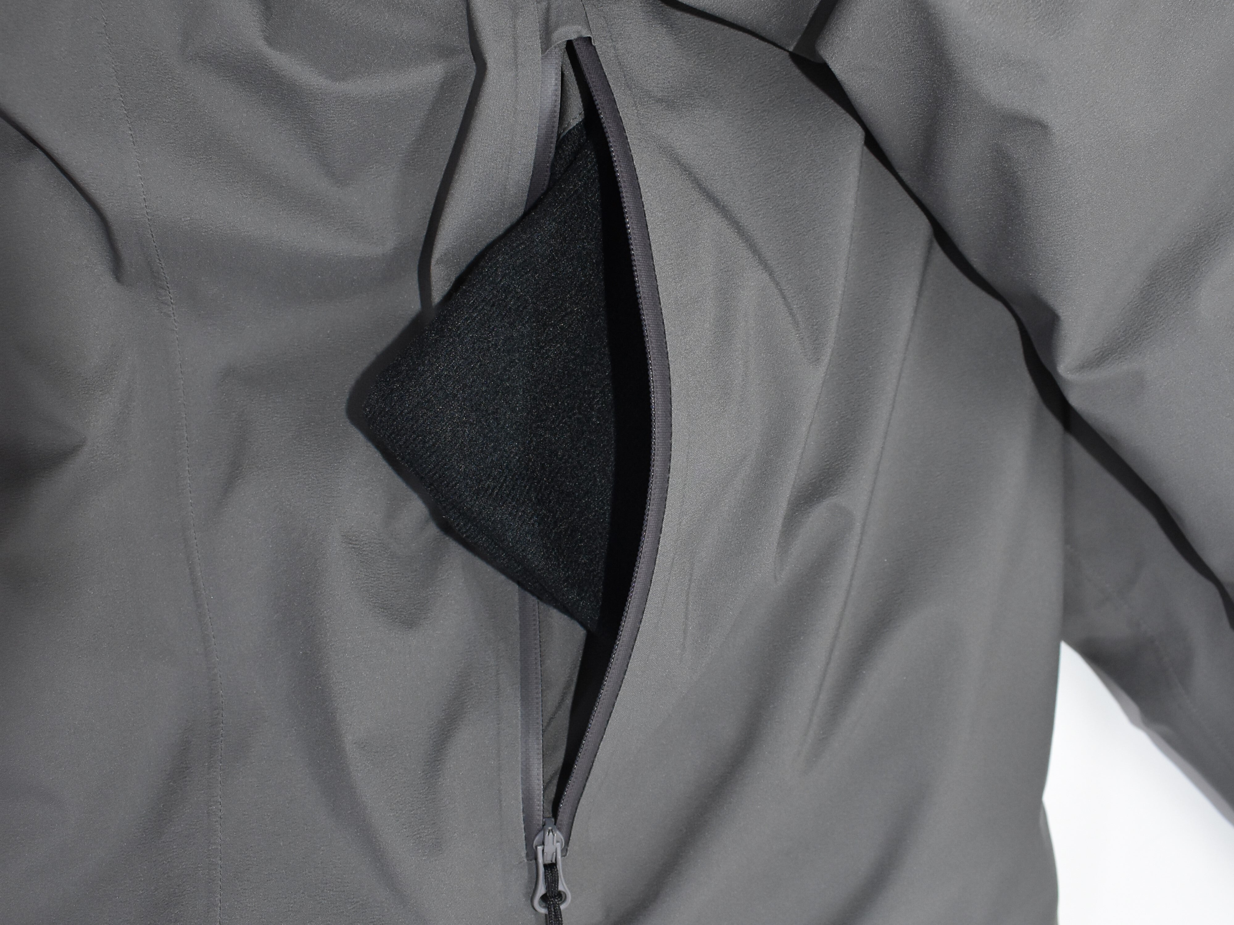 また、フロントファスナー上部にはファスナーのスライダーが直接顎に当たらないよう保護するカバー (チンガード) と、ファスナーと生地との隙間から水が入りにくいようにスライダーガレージを取り付けています。