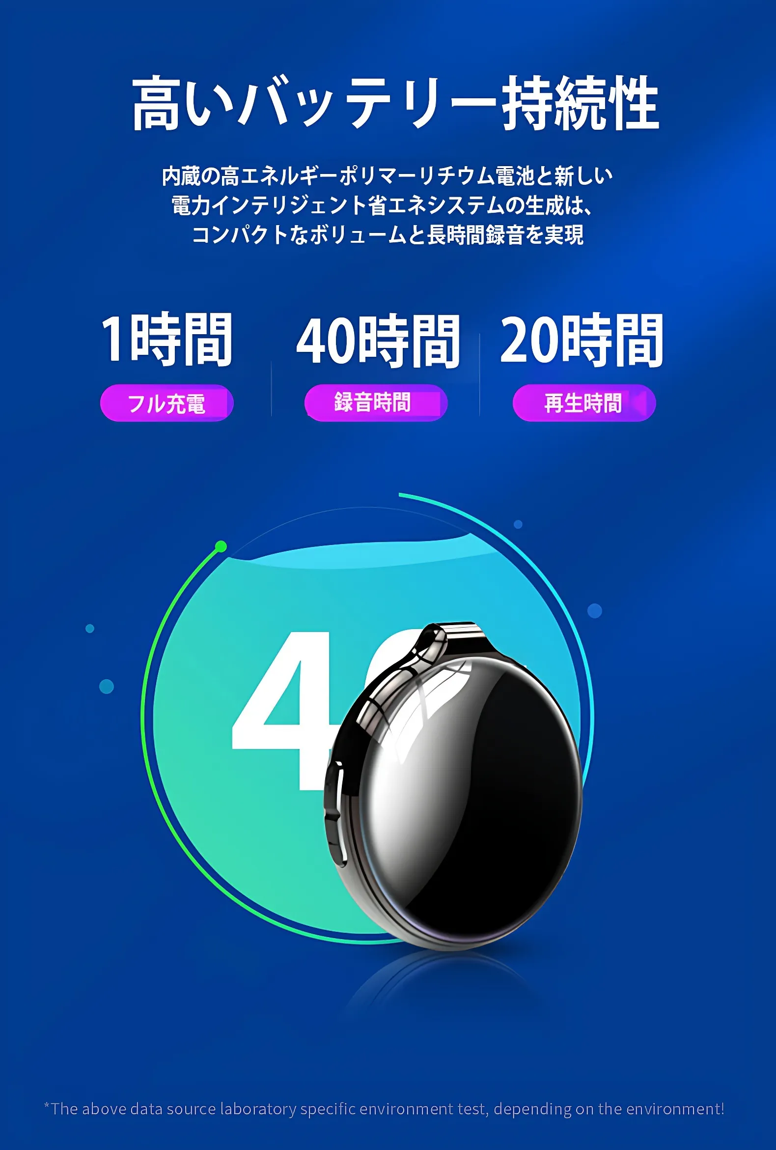 大容量のバッテリーを内蔵しているため、充電時間1時間でフル充電、最長40時間録音、20時間再生可能です。