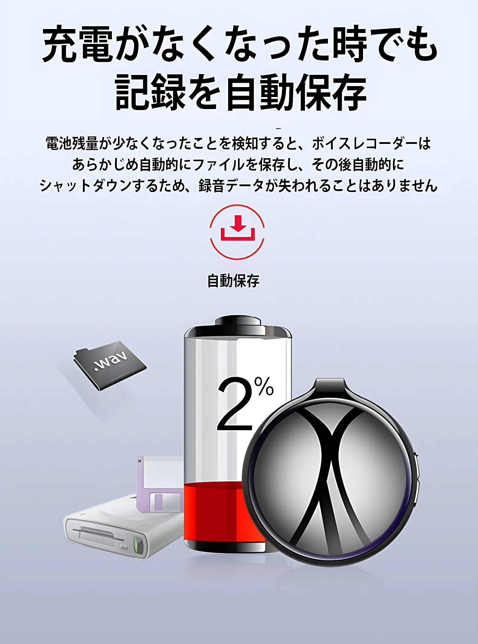 充電が少なくなるとボイスレコーダーがあらかじめ自動的にファイルを保存し、その後自動的にシャットダウンするため録音データが失われることはありません。