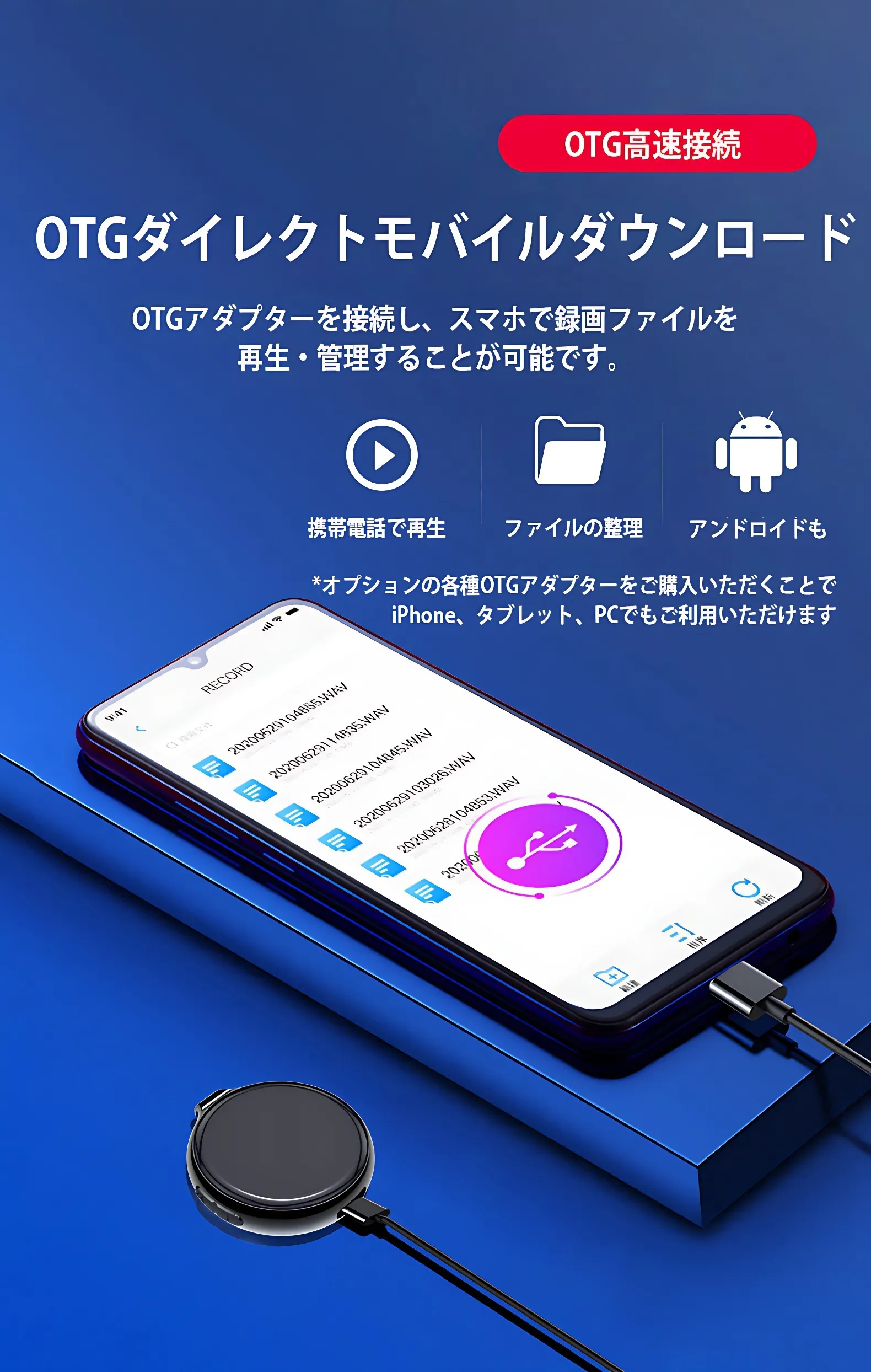 OTGアダプターに接続しスマートフォン/タブレット/PCなどあらゆるデバイスでで録画ファイルを再生、管理することが可能です。