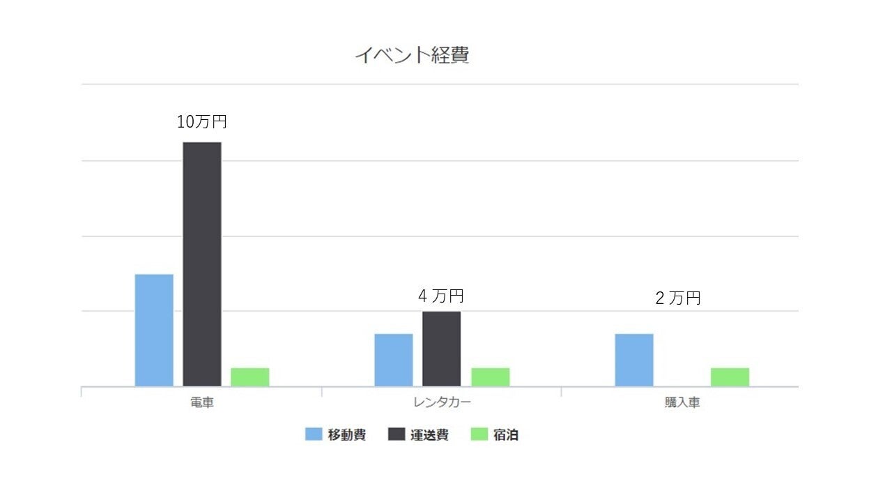 下のグラフを見てもらうとわかるように、レンタカーや機材車を使用しても移動に伴う費用(交通費・ガソリン代・高速代など)はかかってしまいますが、機材の運搬にかかる費用は大幅に削減ができます。