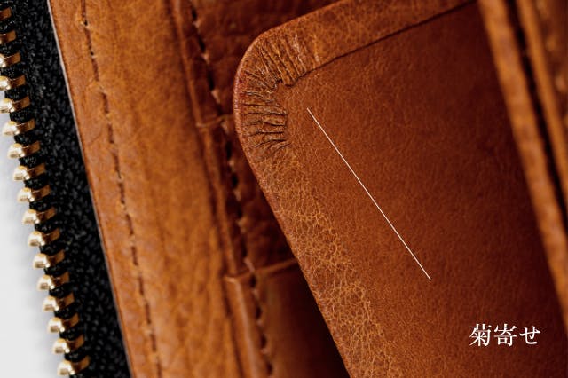 丸みを帯びた部分のたるんだ革を寄せていく手法。菊のようにみえることから菊寄せとよばれています。裏側で一見目立たないところですが、職人の技量があわられる大事なポイントです。
