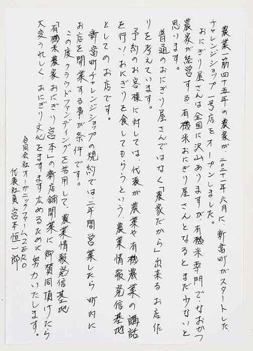 『おにぎり宮本』のオーナーは、20年にわたり有機農業に挑戦してきた宮本恒一郎です。2年前、農業一筋45年のベテラン農家がおにぎり屋を開くという(かなり無謀とも思える!?)挑戦に踏み出しました。ありがたいことに、お客様による口コミやローカルメディア各社に取材・掲載していただくことで、町内外に常連のお客様を獲得することができました。私たちは、スタッフを含め地域住民に愛される存在になった『おにぎり宮本』を存続させ、これからも有機米おにぎりを提供していきたいです。