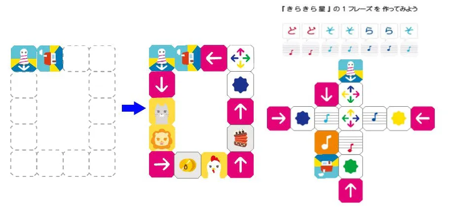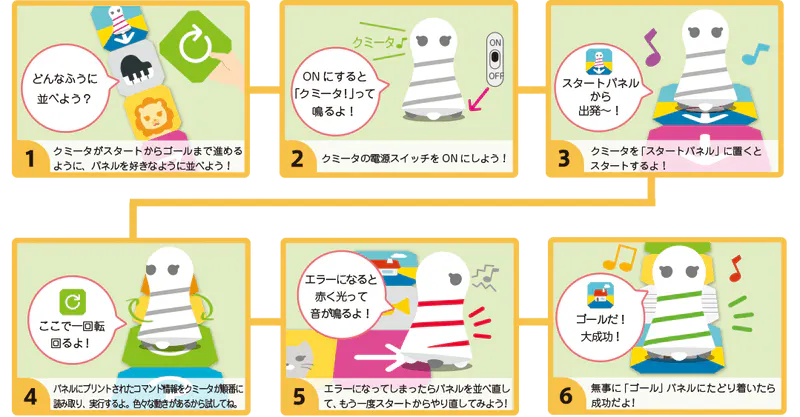 ロボットを出発させるパネルで目的地のホームパネルでゴール、とても分かり易く、このパネルの間にパネルをいくつか入れ、簡単なコースを作ります。