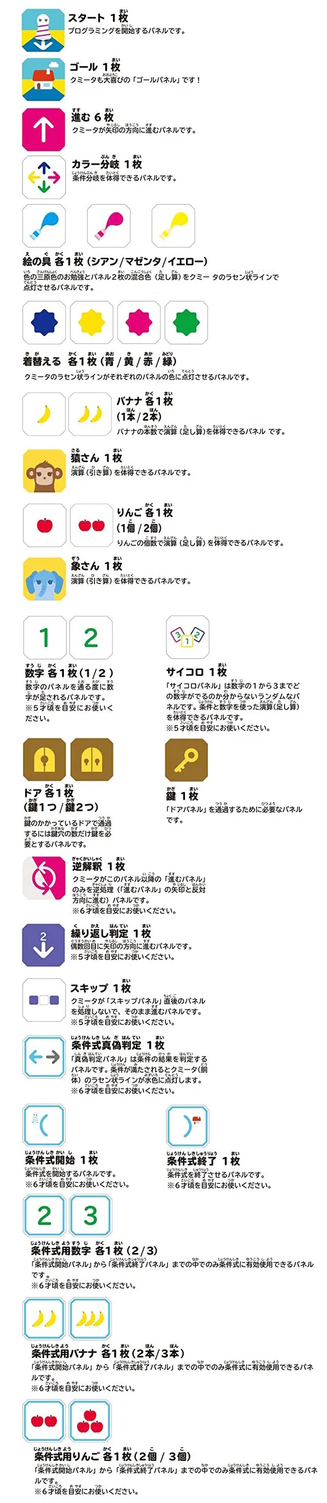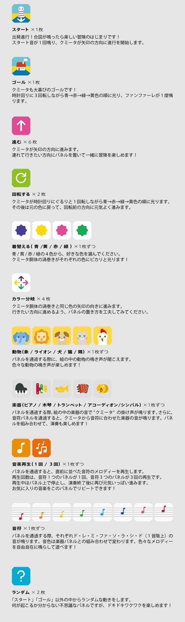 「探して楽しむ」「ダンスして楽しむ」「物語を作って楽しむ」「クイズで楽しむ」「音楽で楽しむ」「コース作りで楽しむ」「色の条件分岐で楽しむ」という基本パネルセットを使った楽しみ方と、