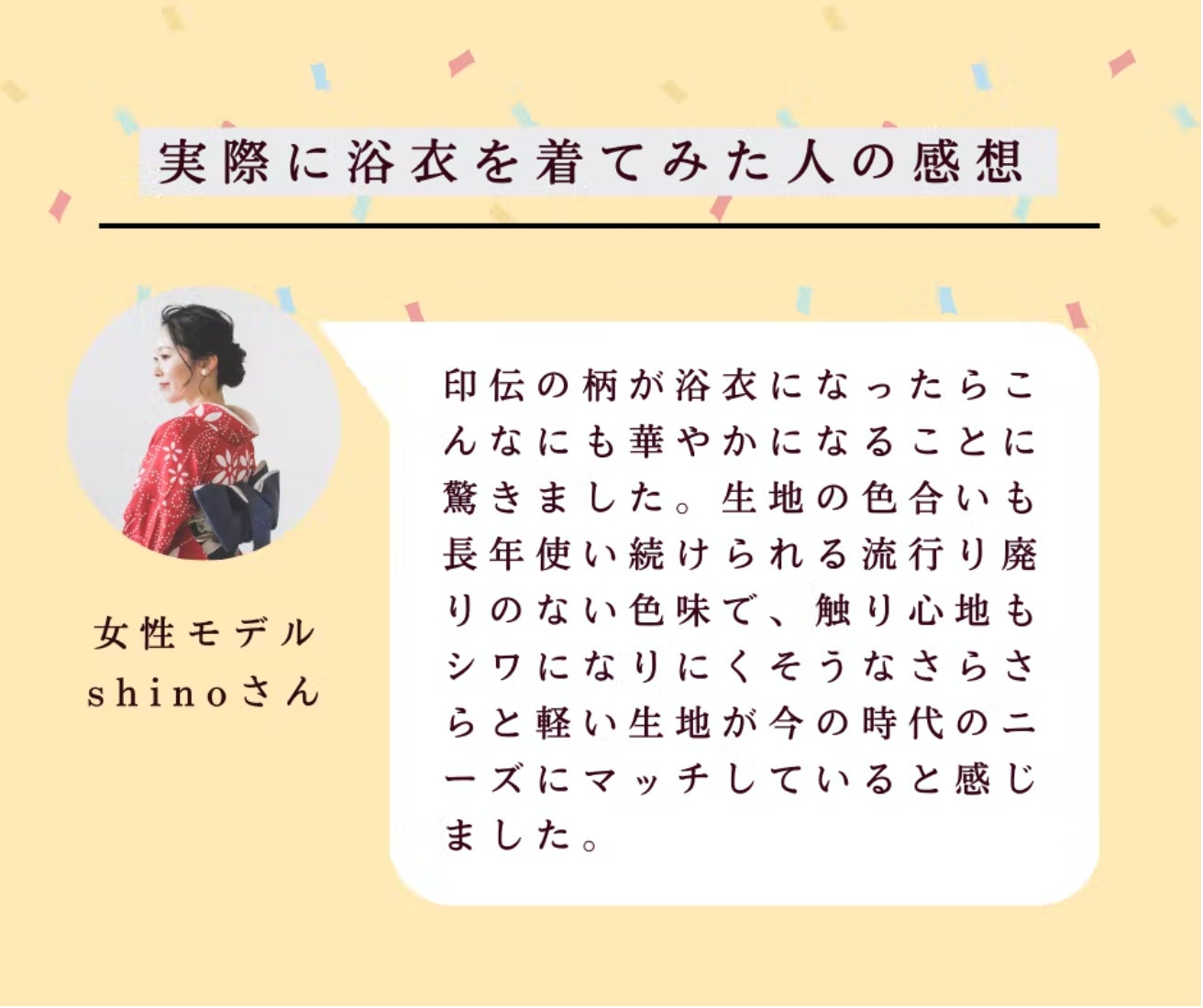 浴衣のモデル撮影に協力してくださった、大学時代の知り合いのshinoちゃん、健史さん、そして記者発表会で浴衣を着て報道陣の前に出てくださった、後輩のゆうこちゃんのコメントを載せています。