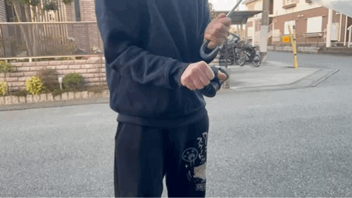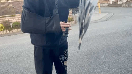 冷たい雨で手を濡らしたくないから、ひもの部分だけ持ってたたむと...