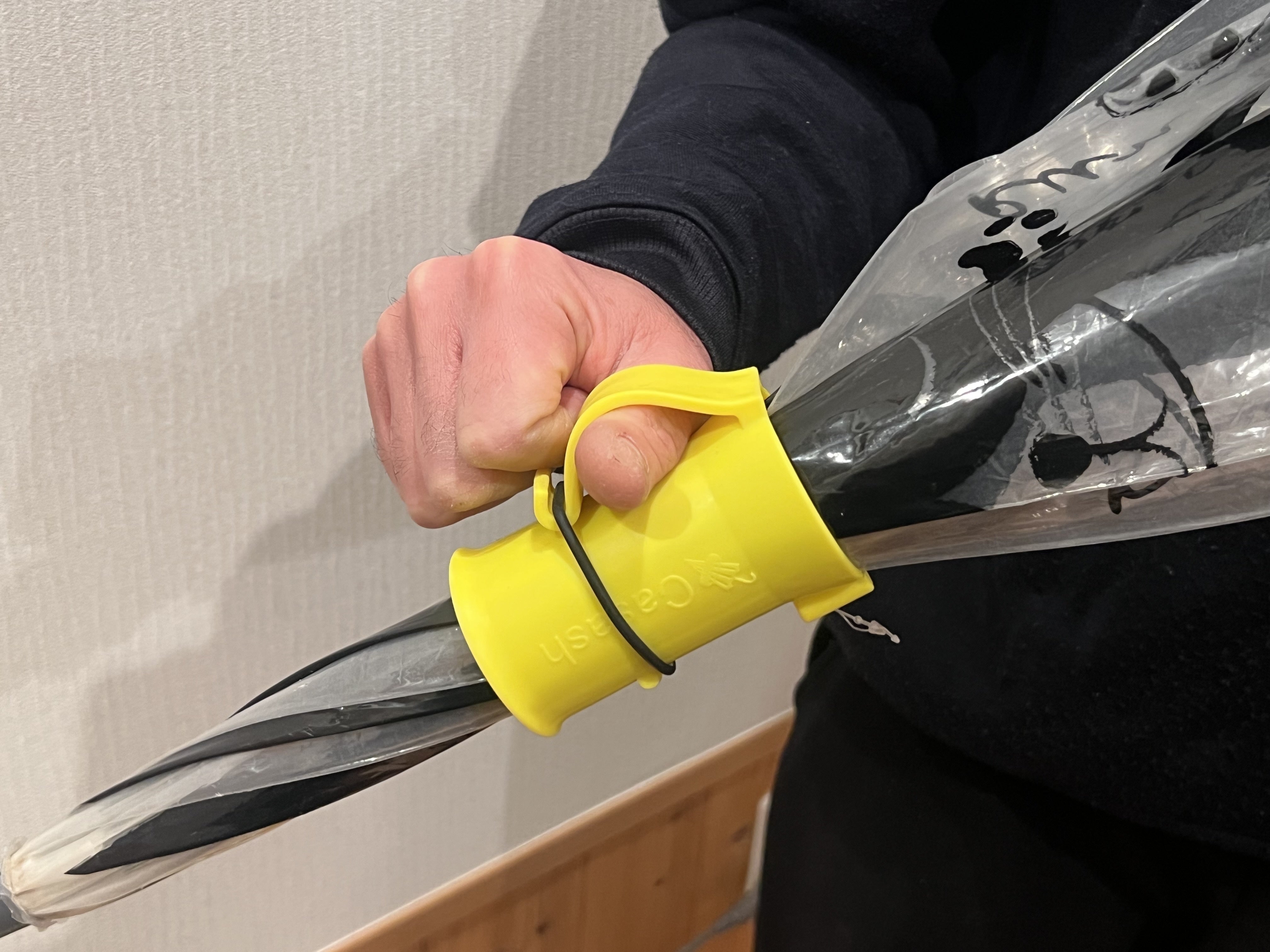 casashをクルクルと回して取り外したら、傘の持ち手にフック部分をゴムが掛かった状態のまま差し込みます。振っても落ちる事はありません。