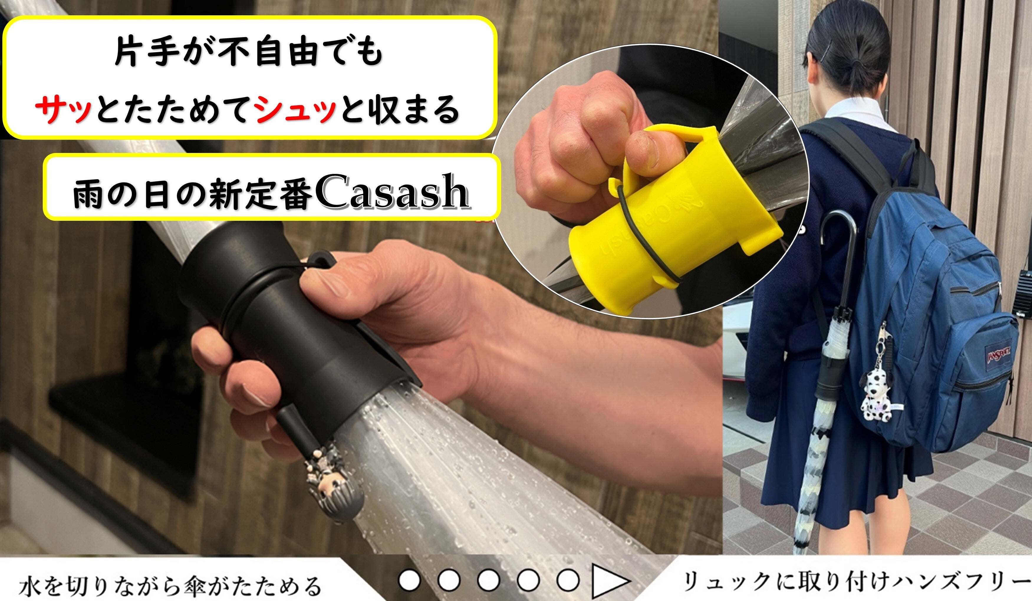 Casashは片手が不自由な時でも、濡れた傘を「たたむ時」「持ち歩く時」の不快感を解消し、
