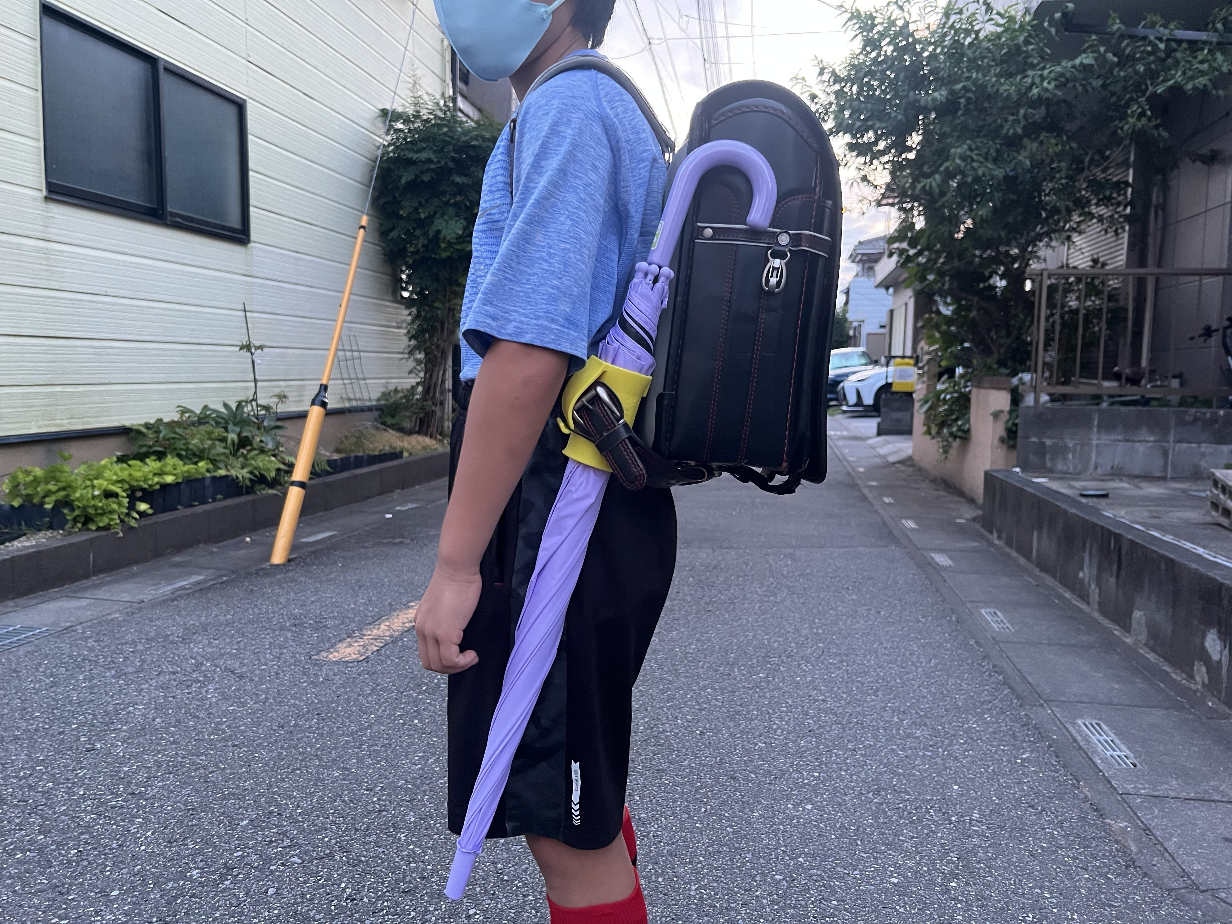 ・リュクやランドセルなどに取り付けている時、サイズによっては傘が足などにあたります。引っ掛けて転倒しないよう注意 注意してください。